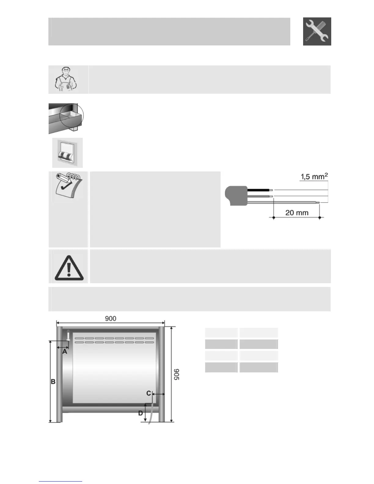 Overall dimensions: location of gas and electrical connection points (all