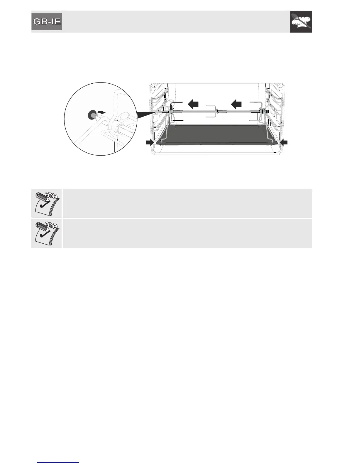 Having prepared the rotisserie rod, place the tray on the first runner (see 7.2