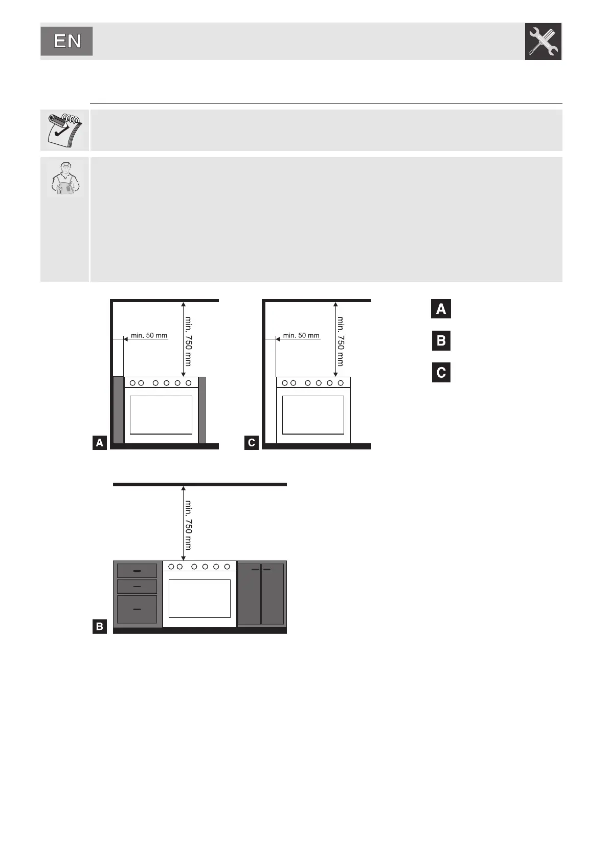 of 50 mm from the side of the appliance, as shown in figures A and C relative to the installation classes.