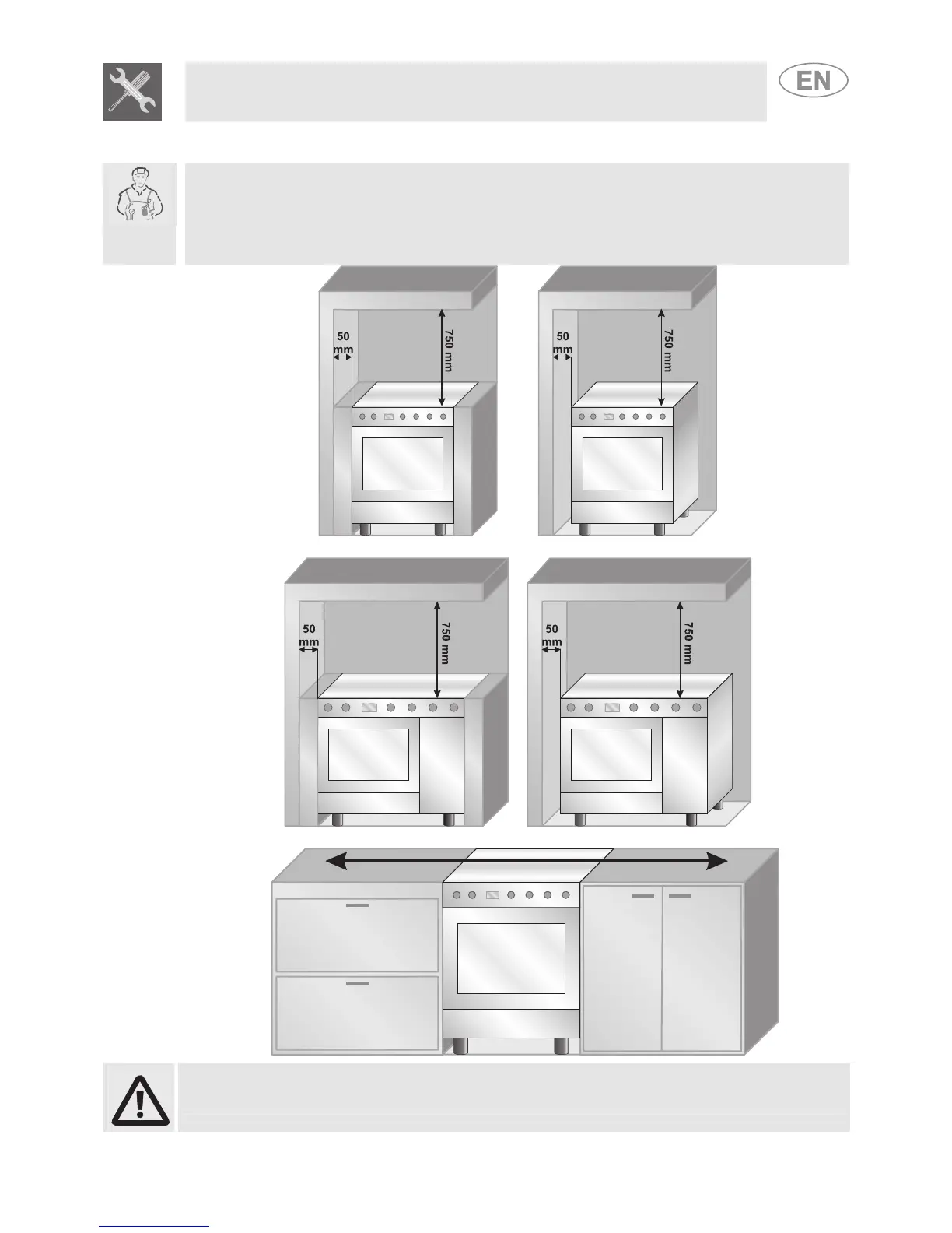 the installation classes. Any wall cupboards or ventilation hoods must be at a distance of at least 750