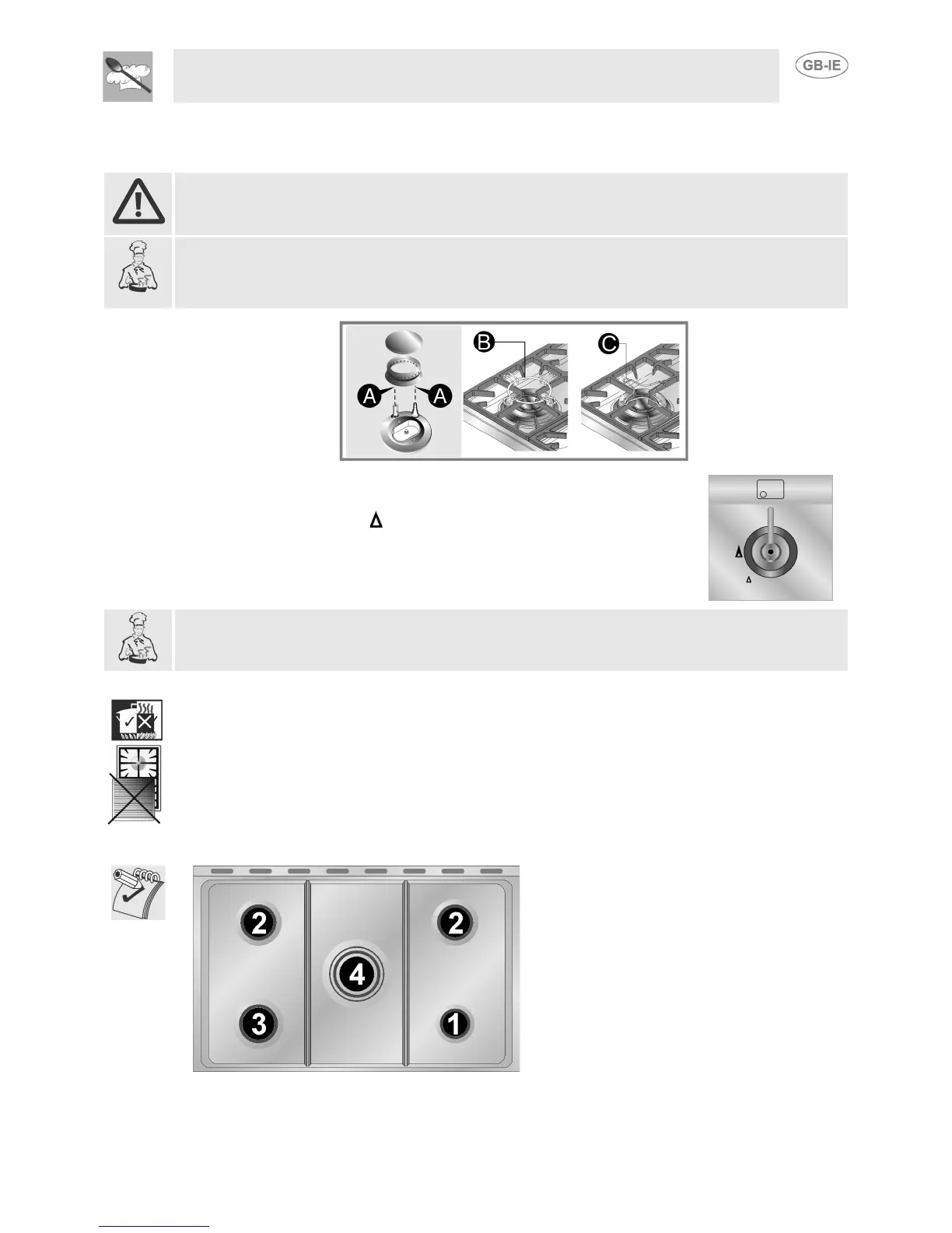 Before lighting the hob burners check that the flame caps are in the correct position and that their burner