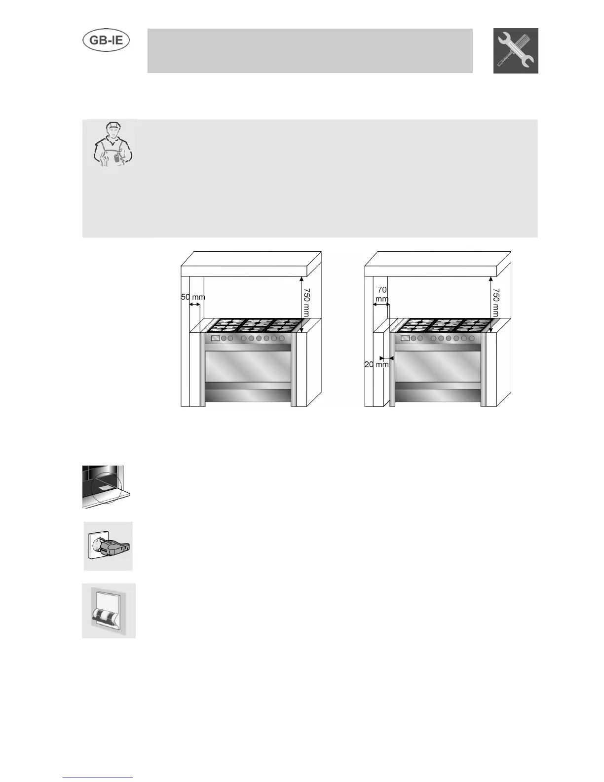 least 50 mm from the side of the appliance, as shown in the drawings A