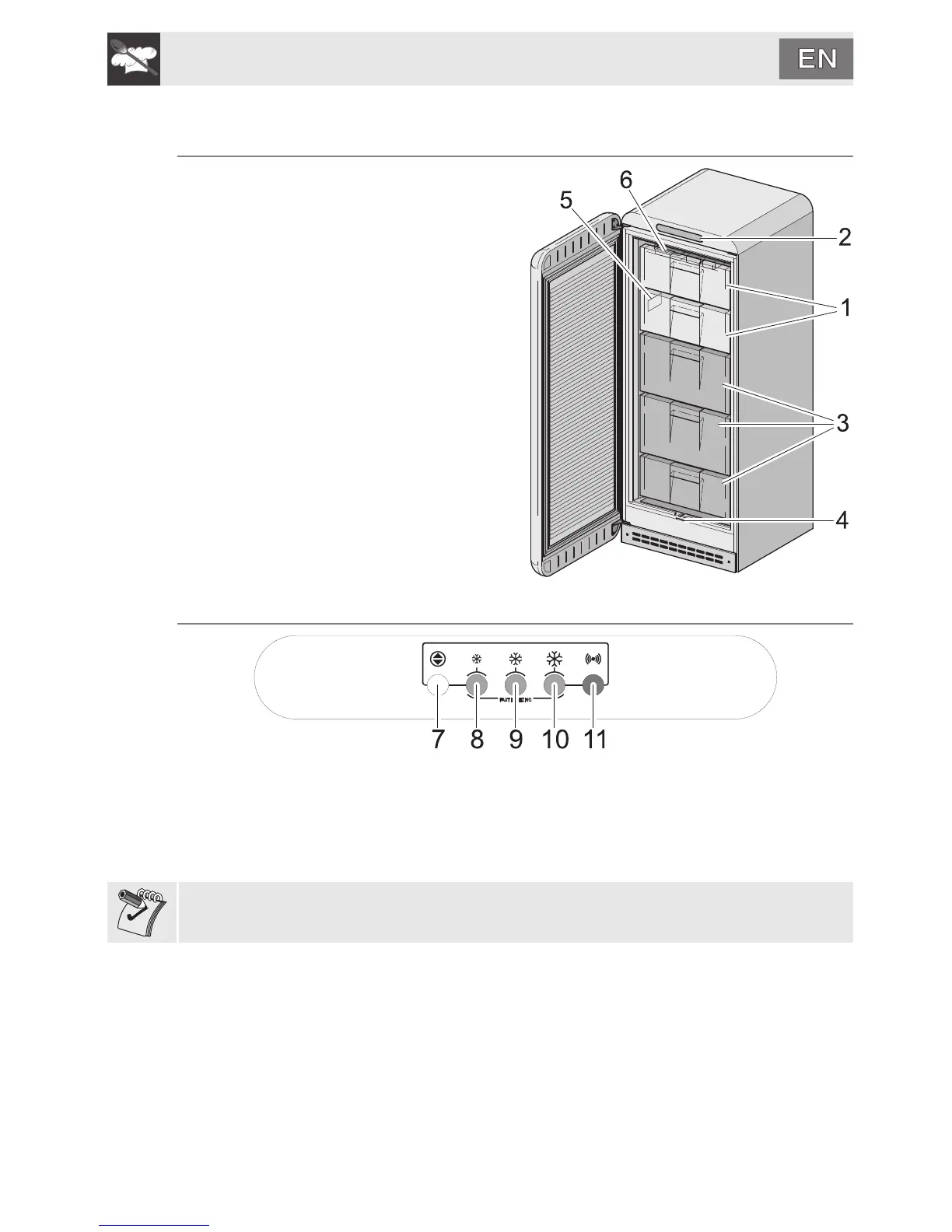 7 Button for turning the appliance on and off, setting the temperature and setting the “rapid freeze”