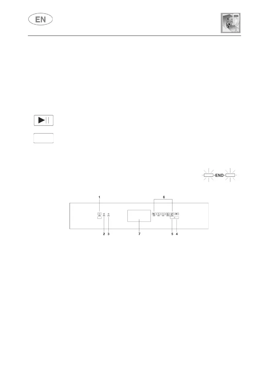 When the ON/OFF button (1) is pressed, the dishwasher switches on.