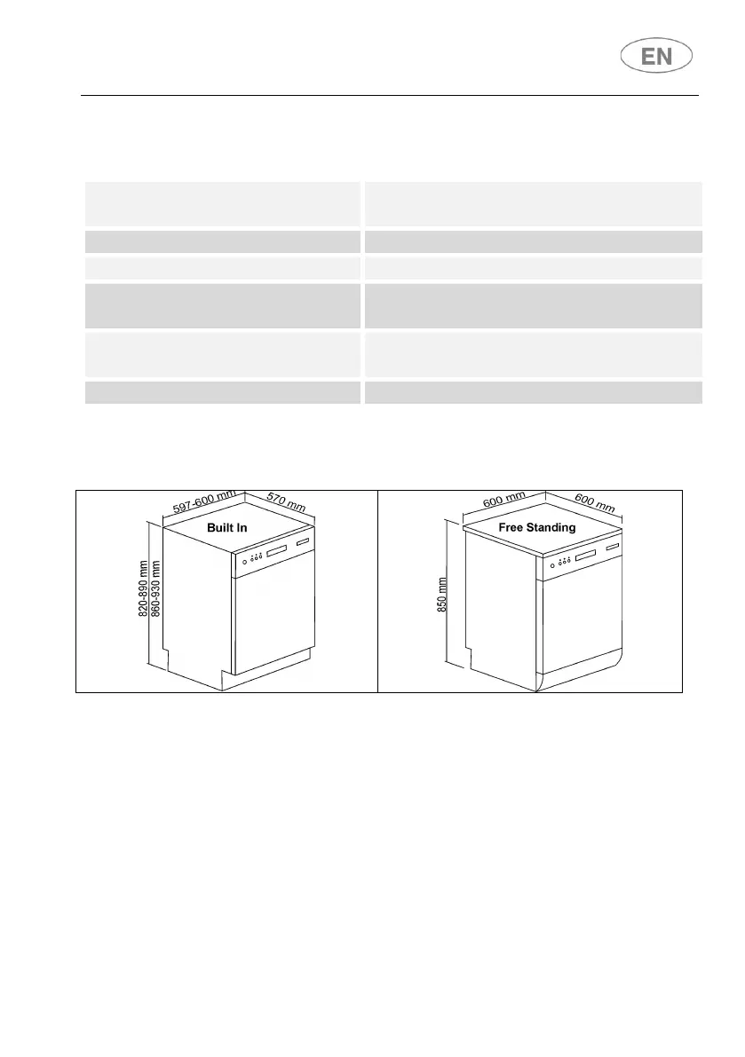 Appliance dimensions (mm)