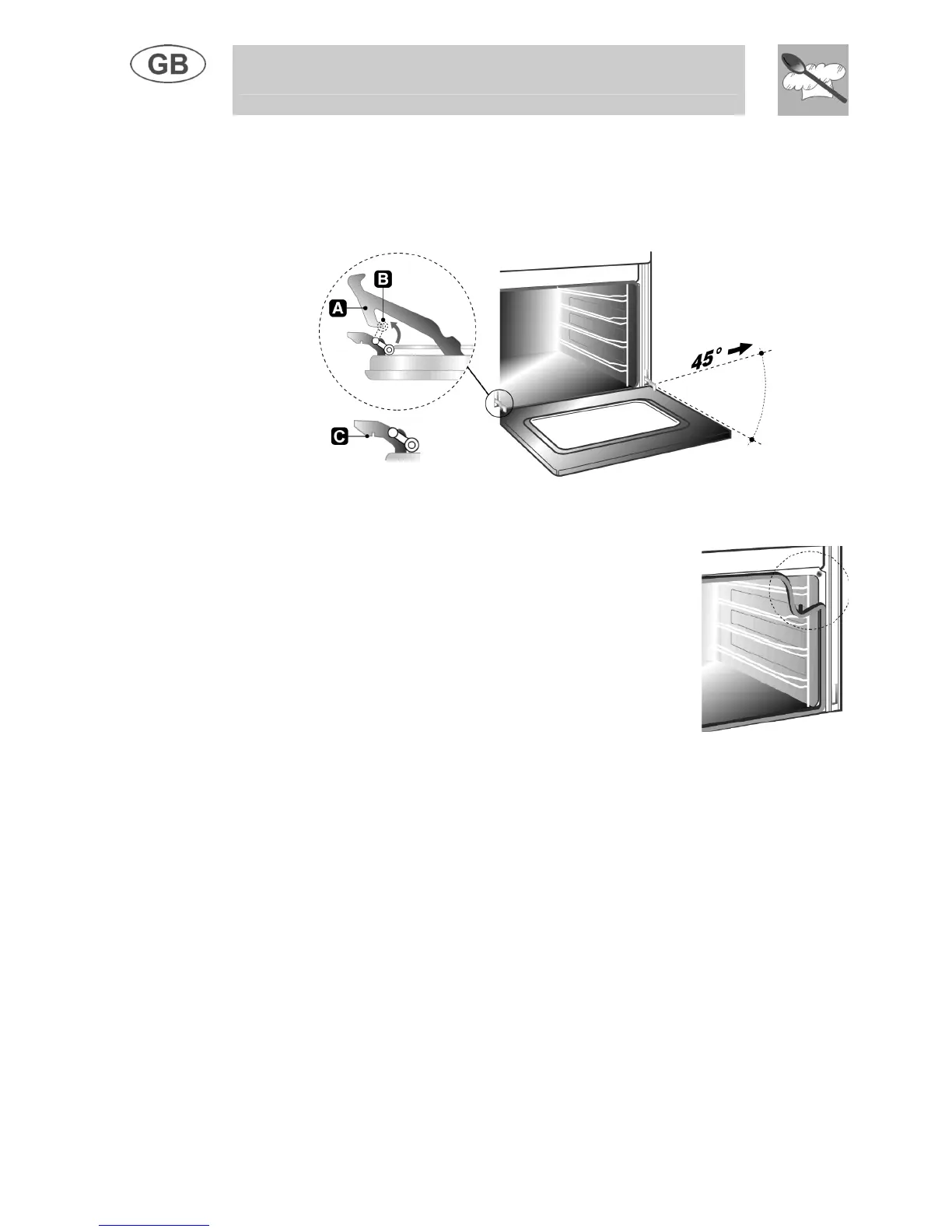 the hinges A in the grooves, drop the door and release levers B.