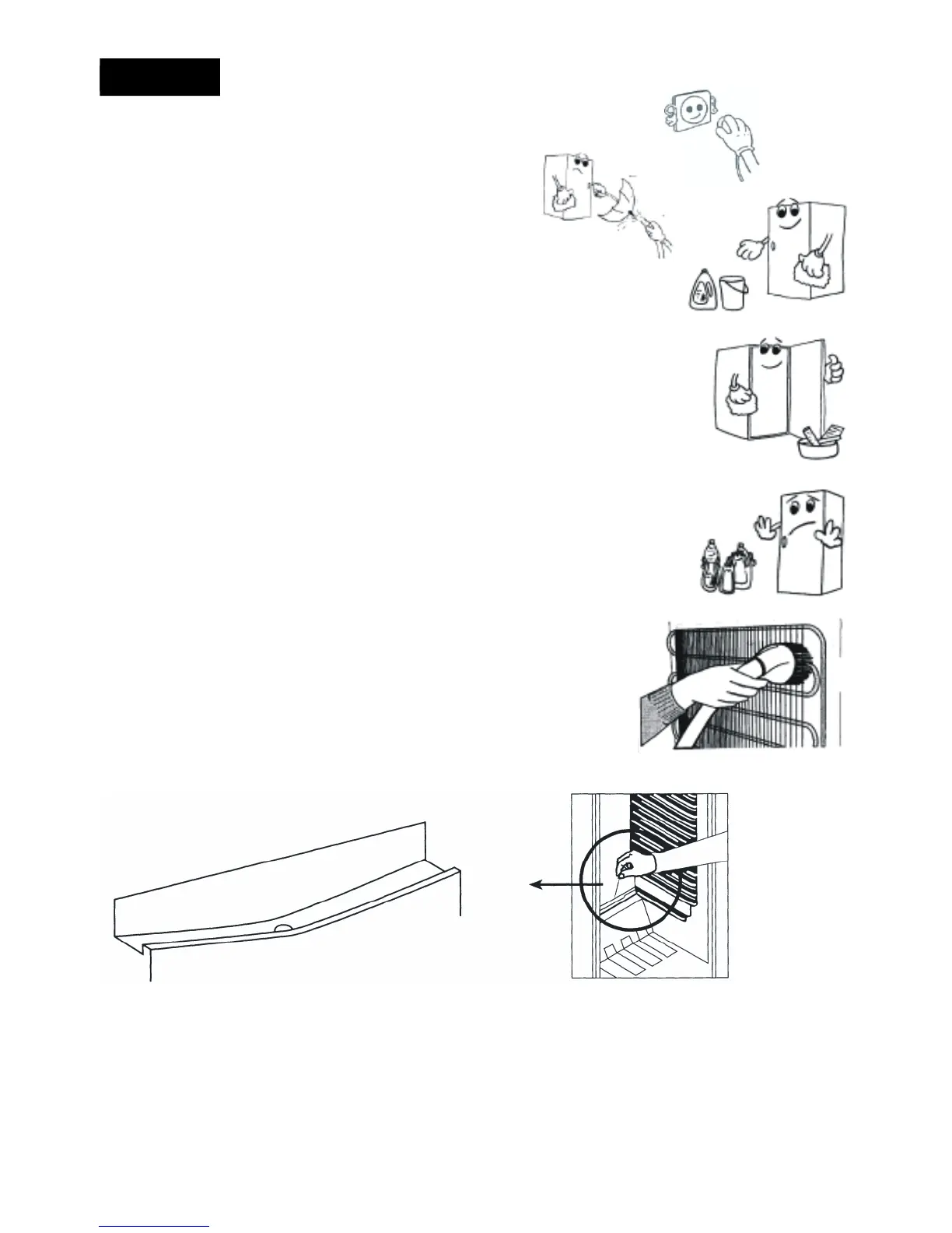 • The evaporating tray and the defrost water drain hole should be cleaned periodically