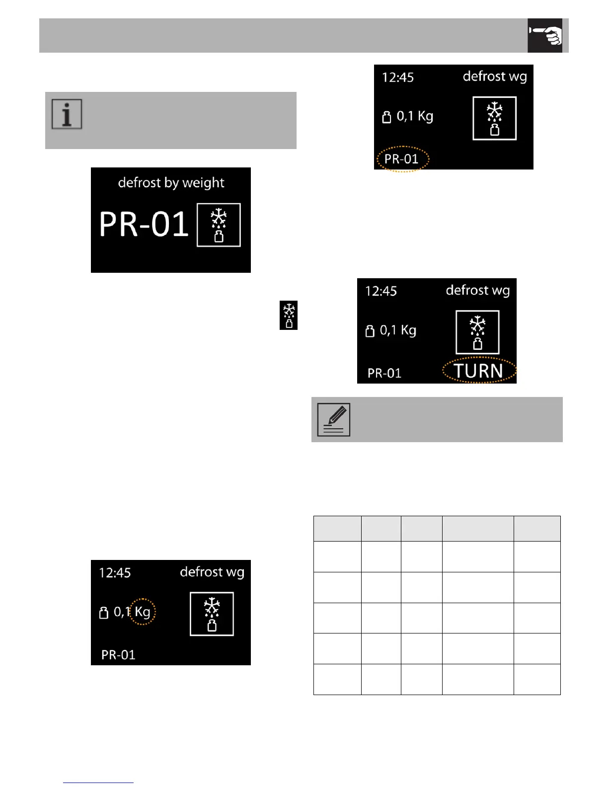 defrosting by weight function, indicating the weight