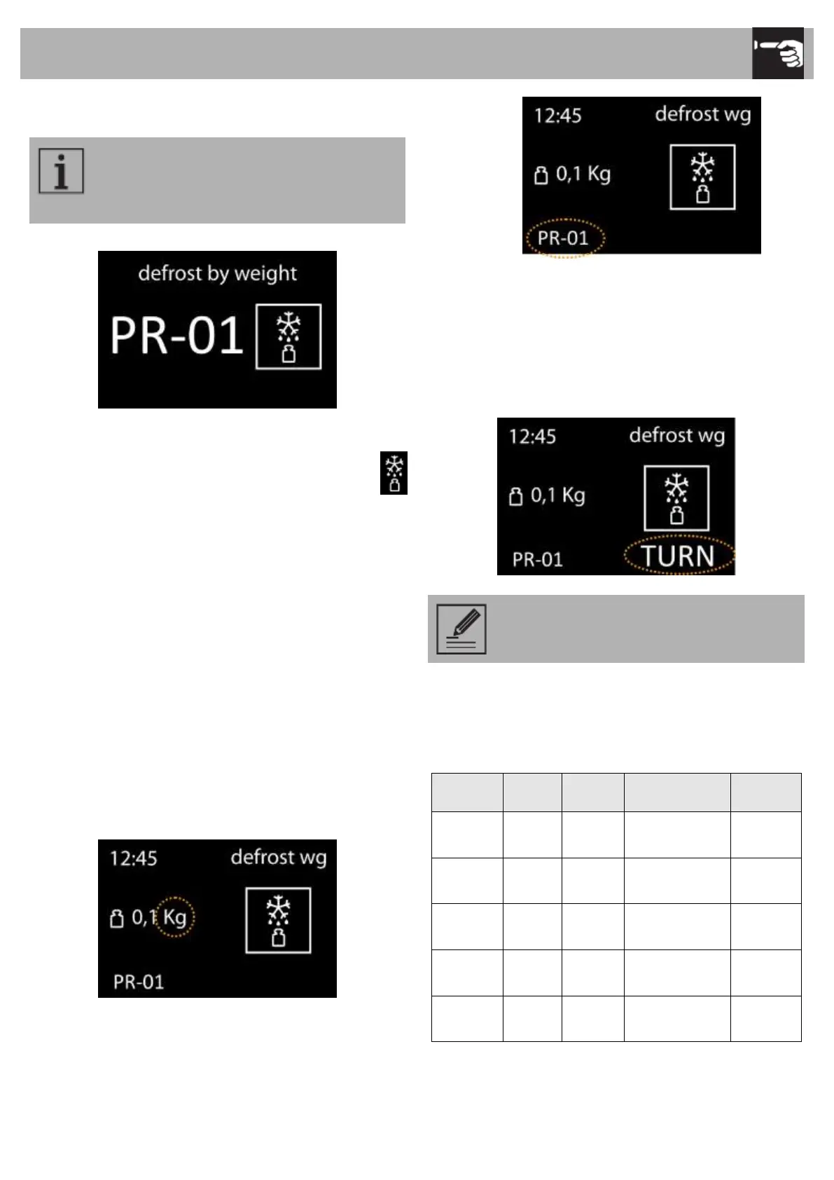 defrosting by weight function, indicating the weight