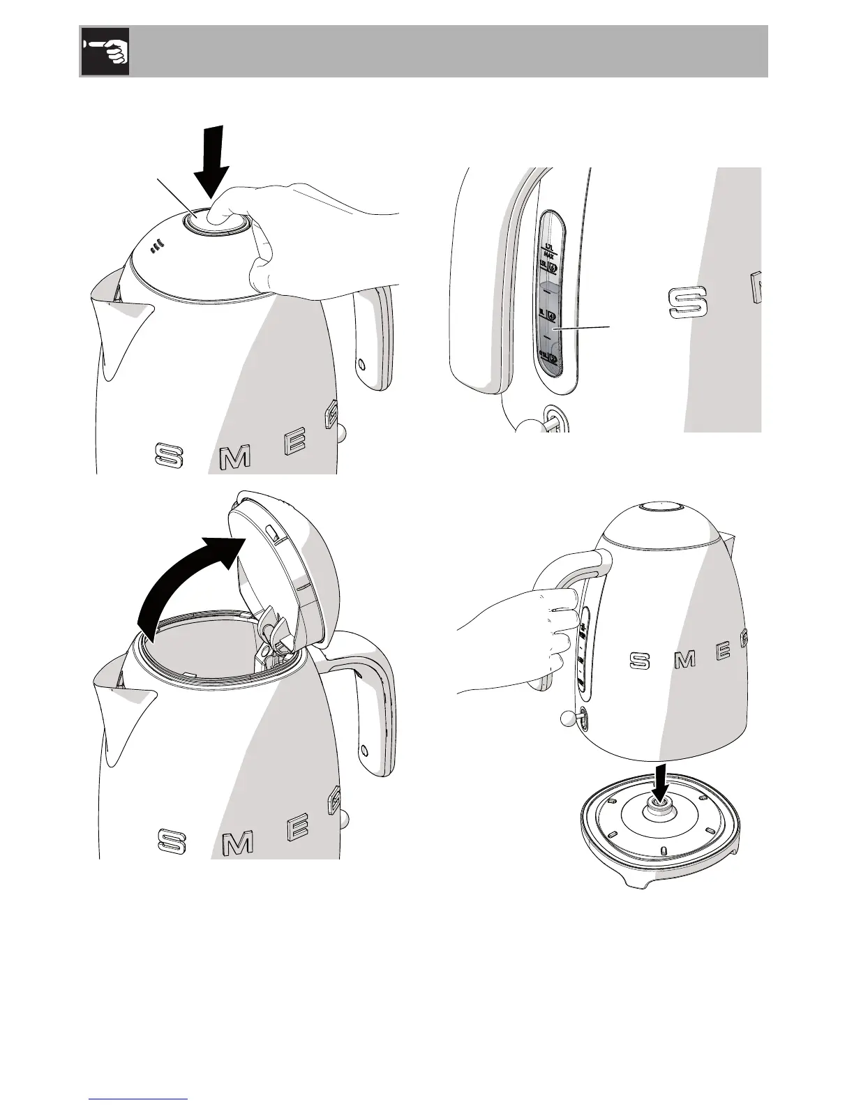 3. Press the button (1) to open the lid. 4. Fill the kettle with the required quantity of