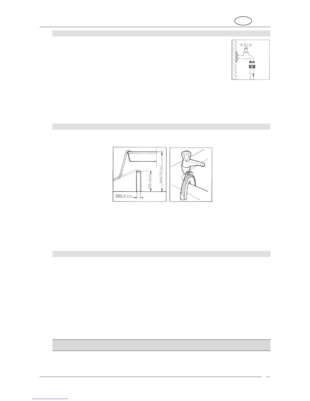 1. Insert the end of the drain hose into a drain pipe having inside diameter of at least 4 cm, at least 50 to 90 cm