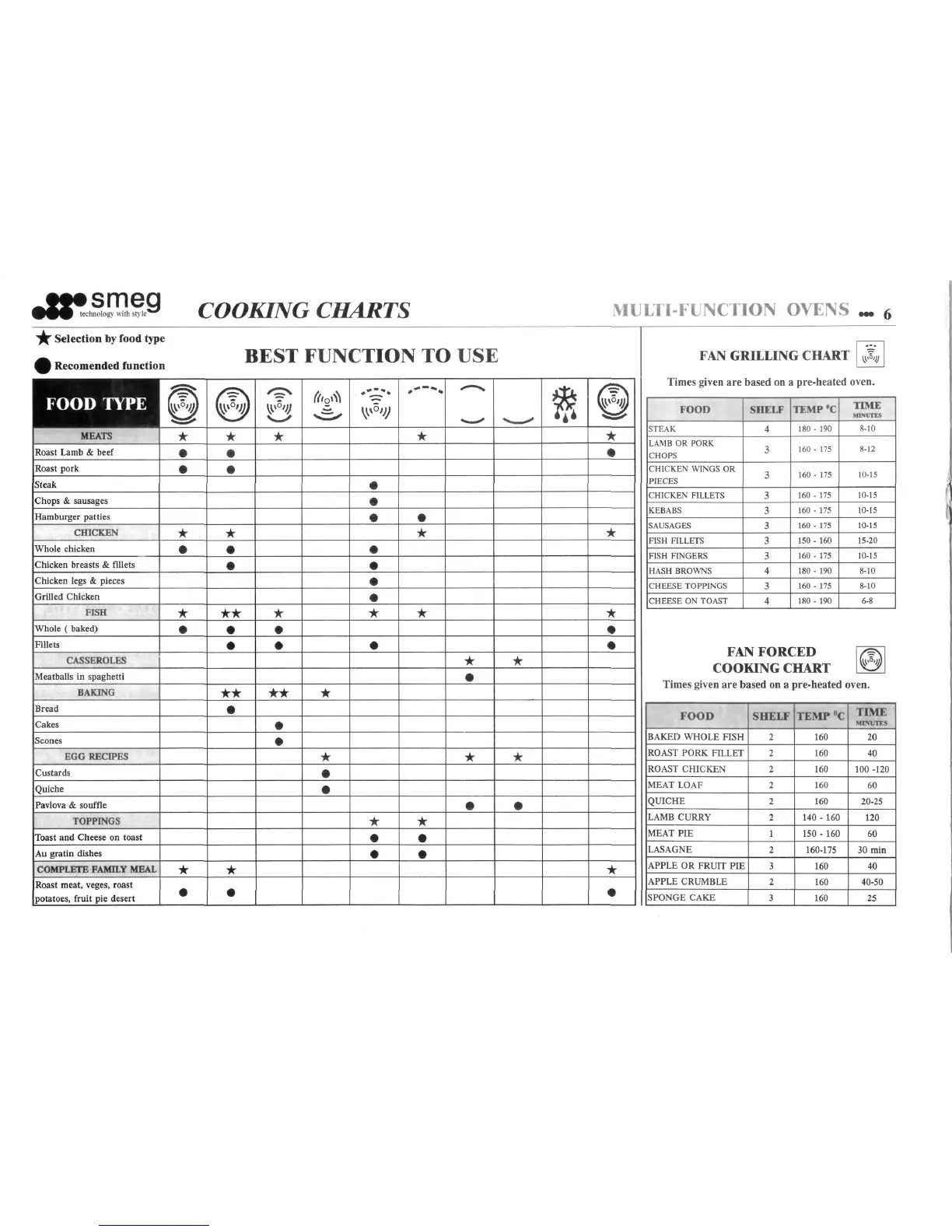 Smeg Multi-function Built-in Ovens - Cooking Charts; Recommended Functions by Food Type; Fan Grilling Cooking Chart; Fan Forced Cooking Chart