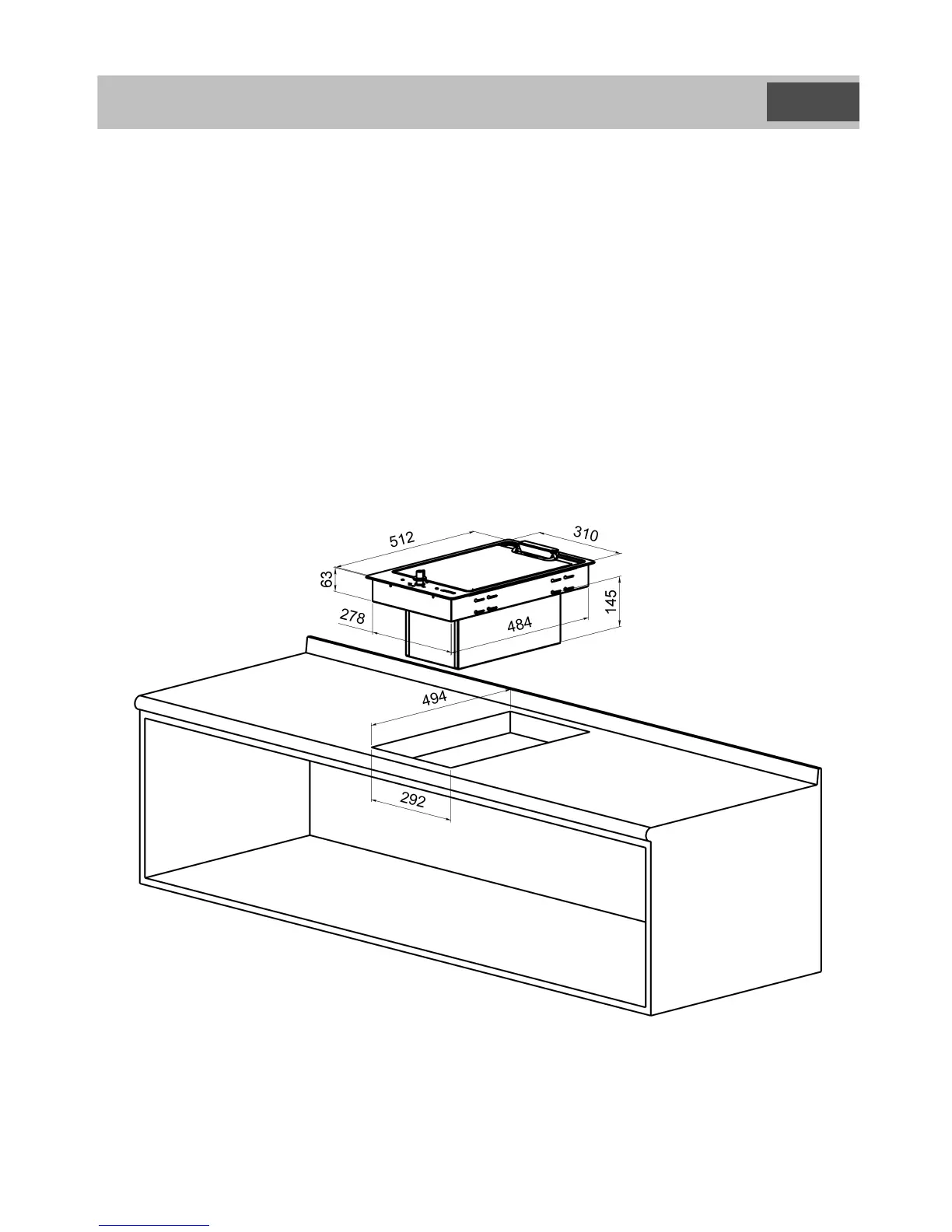 Dimensions of hole cut in work surface : 494 X 292 mm