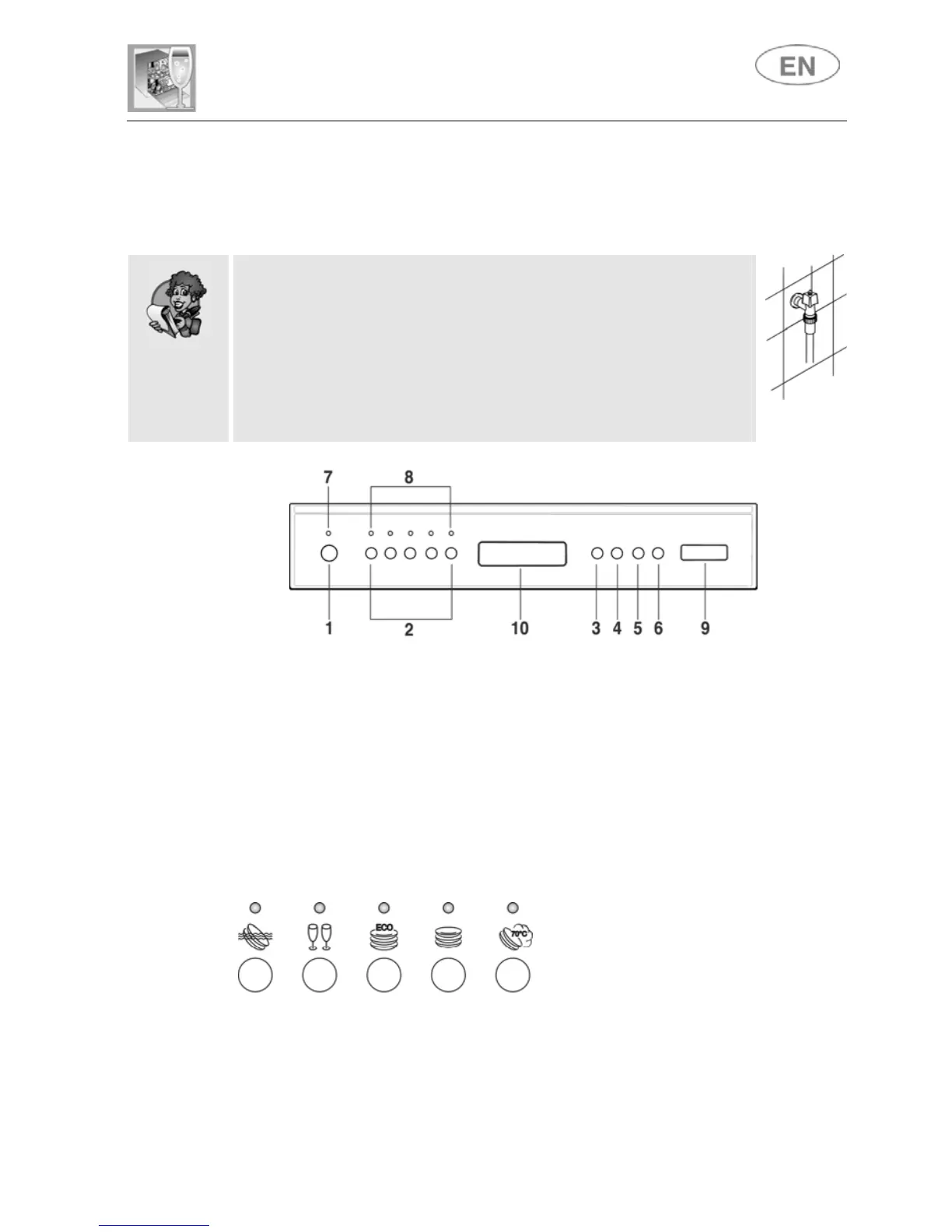 Pressing the ON/OFF button (1) will start the dishwasher and will lit up