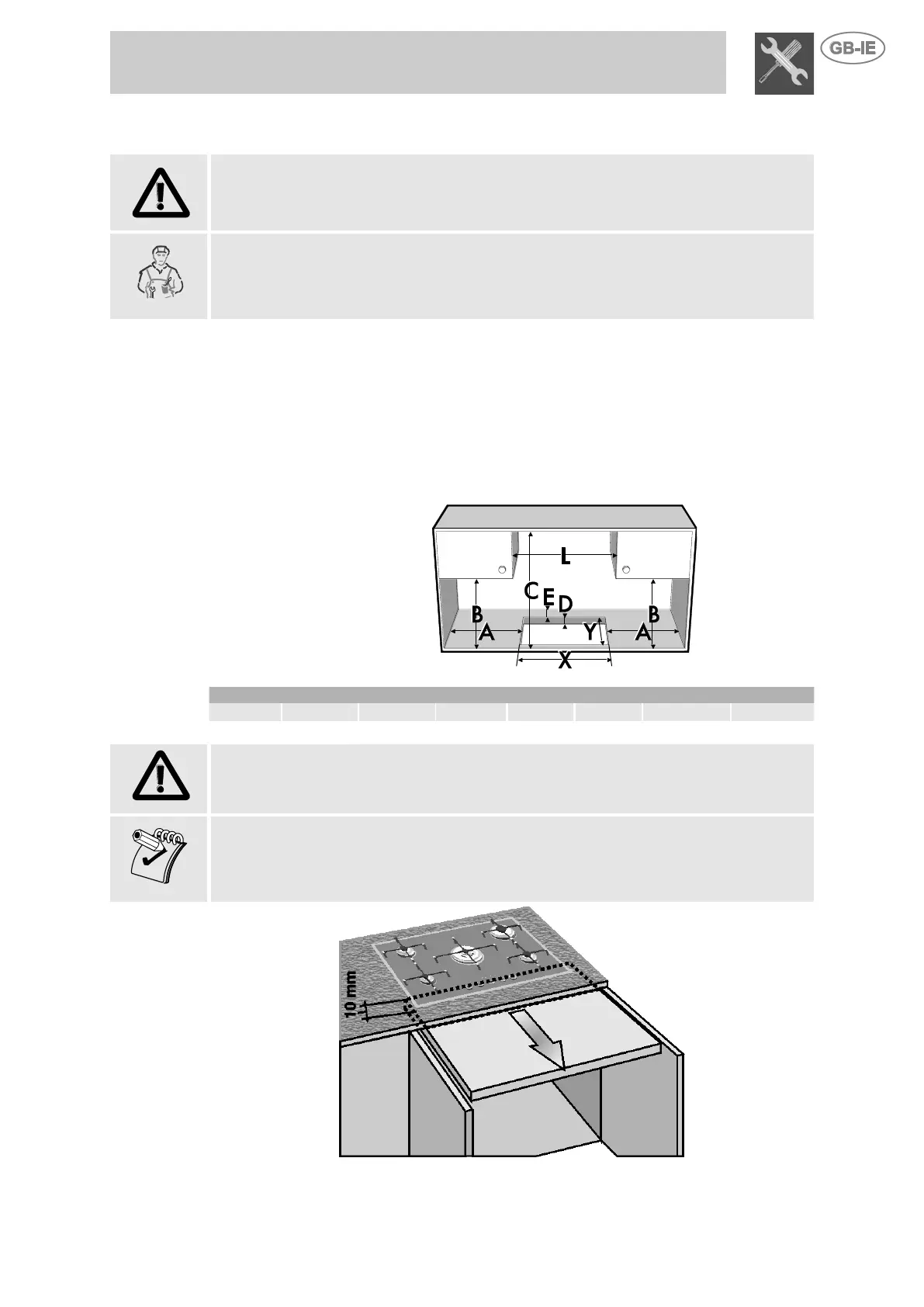installed underneath it. Leave a gap of at least 10 mm between the bottom of the hob