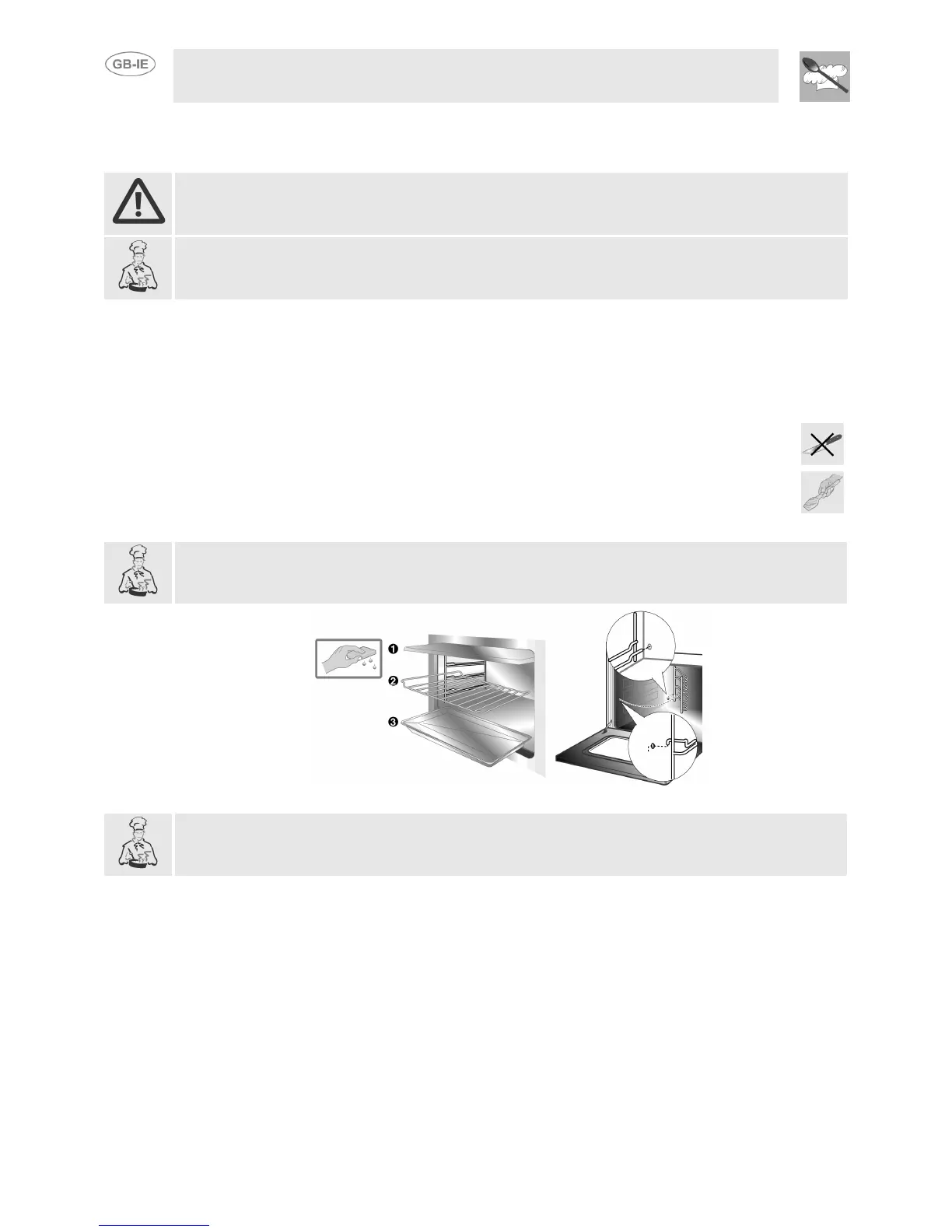 Clean the oven shelves with hot water and non-abrasive detergents, rinse and dry.