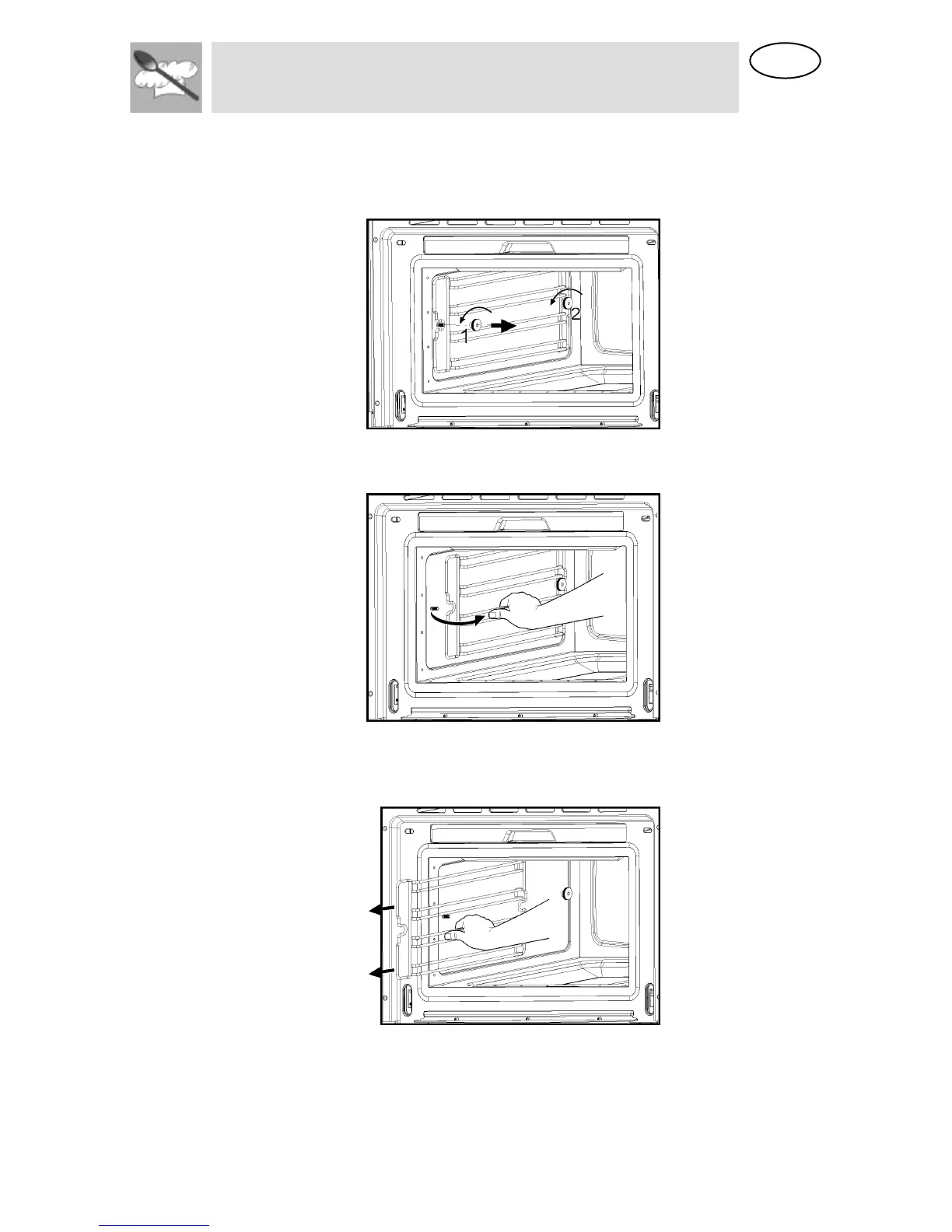 To put them back, insert the shelf guides into the knurled nuts 2 in the