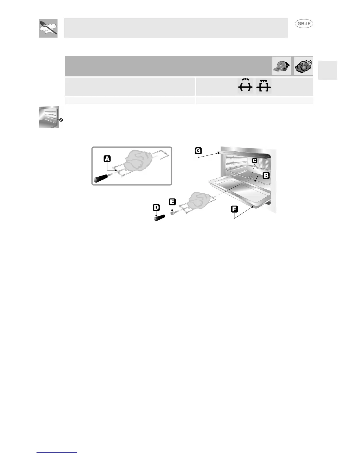 Prepare the food on the spit rod and block fork screws A. Insert the frame B in the second level from the