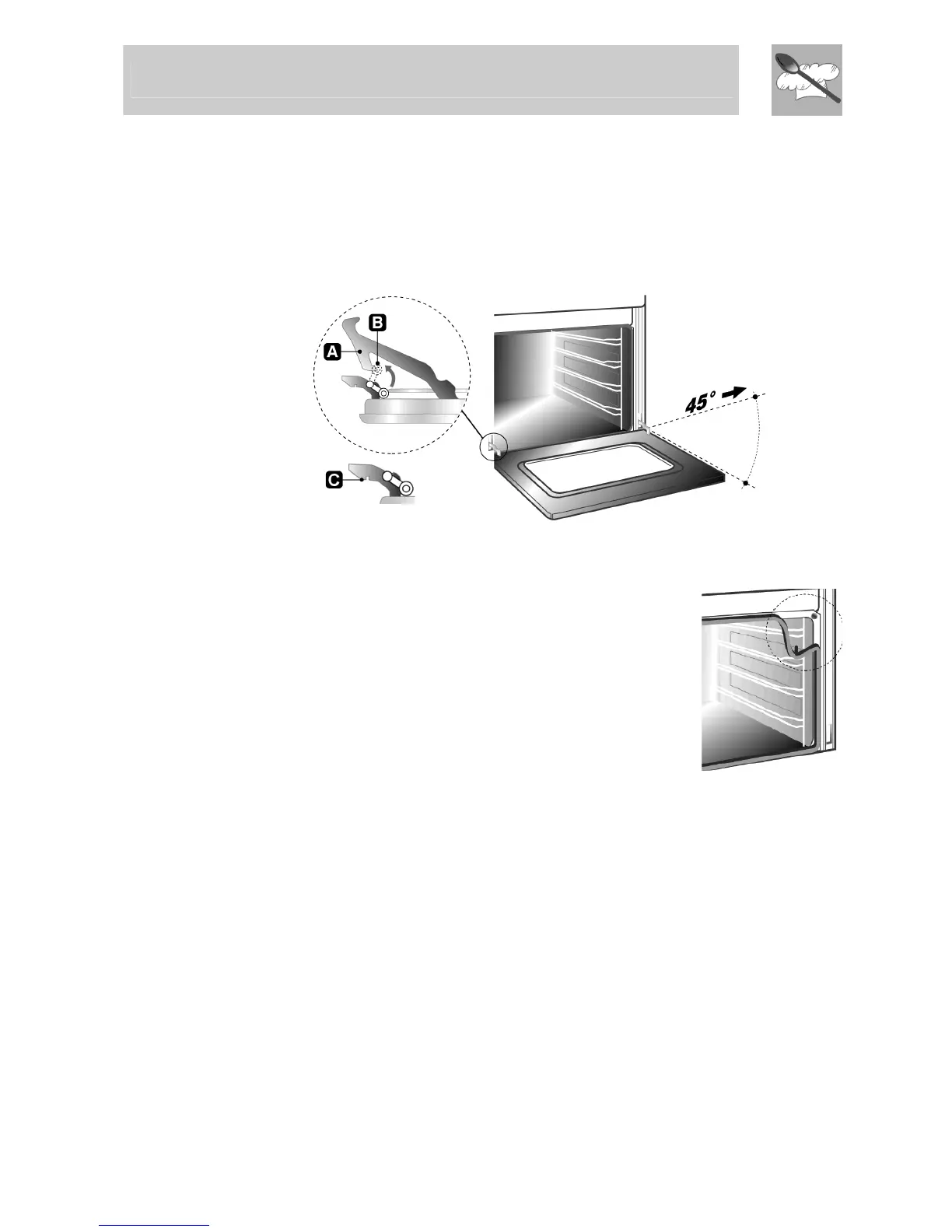 the hinges A into slots in oven frame. Locate the grooves (C) over frame of