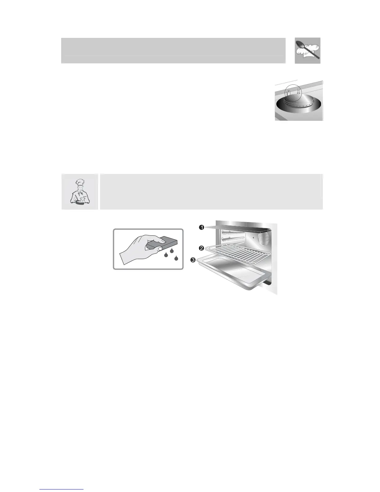 • Clean the oven grill with hot water and non-abrasive detergent.