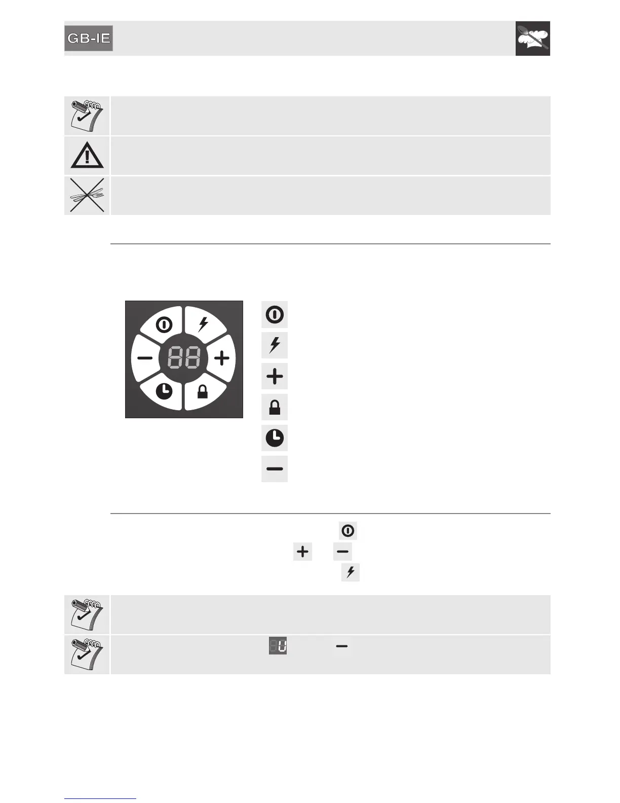 hob is controlled by means of the Touch Control sensor keys. Lightly touch a symbol on the glass