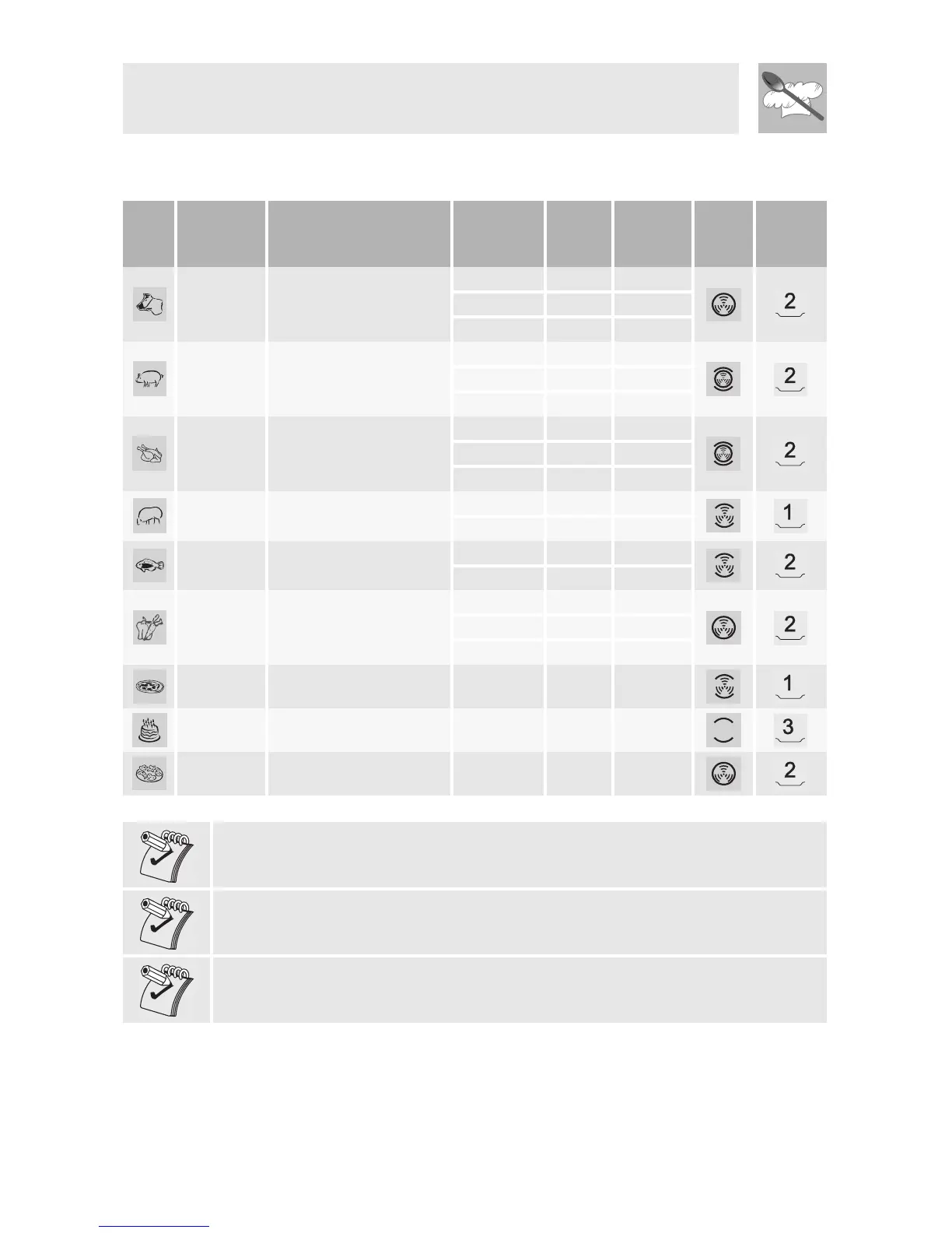 The cooking times specified in the table refer to the food indicated in the recipe;