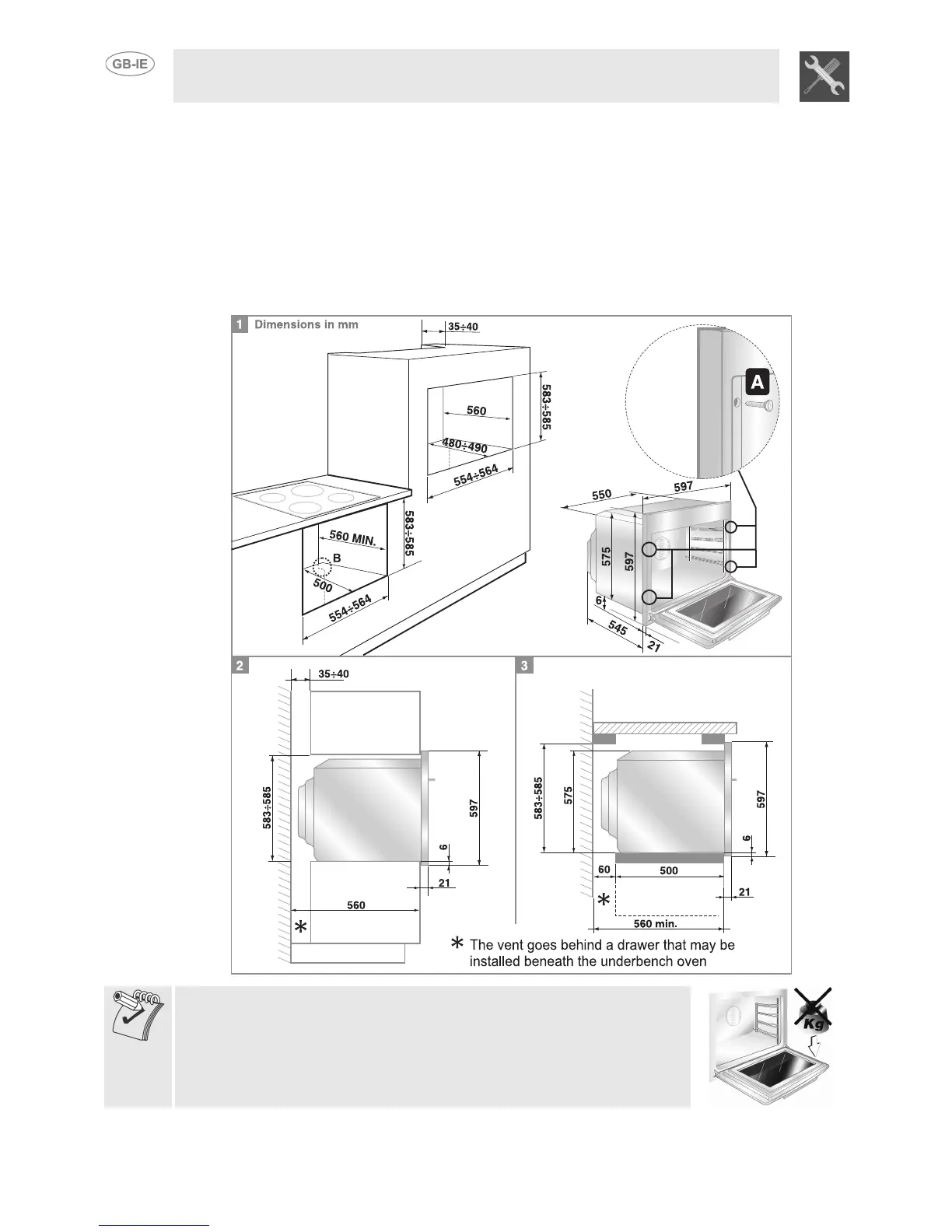 dimensions shown in figure 1-3. When installing under worktops incorporating combined hobs, a gap of
