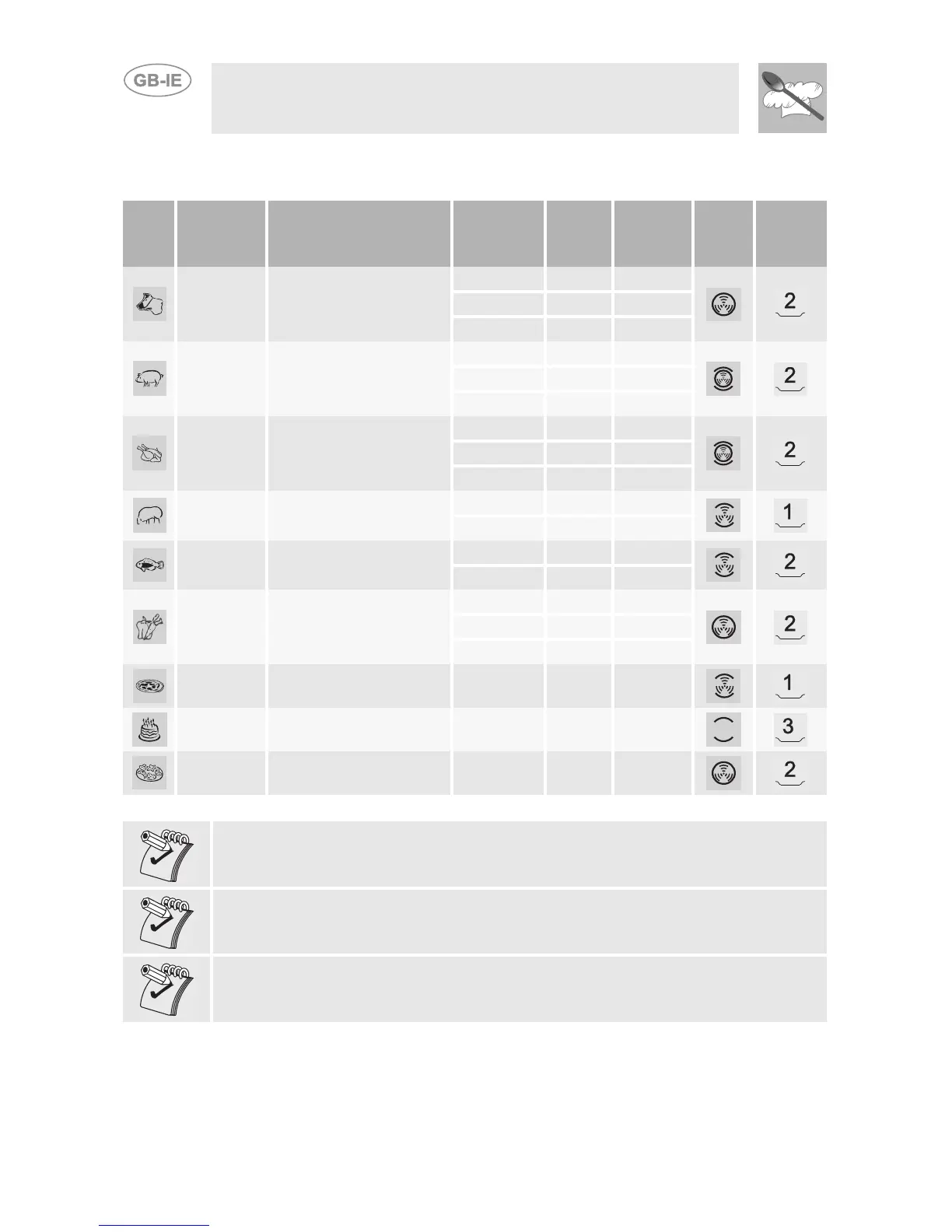 The cooking times specified in the table refer to the food indicated in the recipe;
