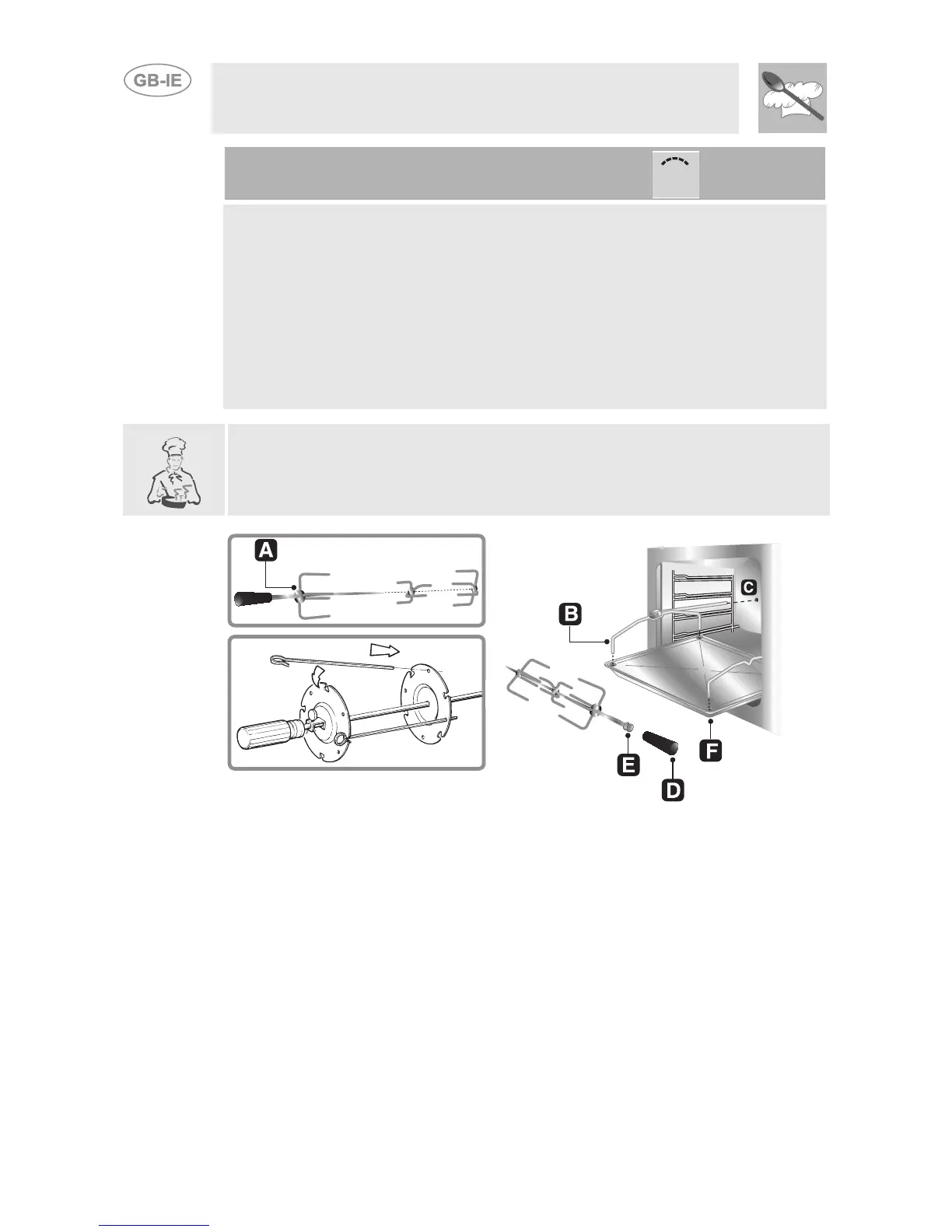 of the rotisserie rod enters the hole C on the rear wall of the oven. Place