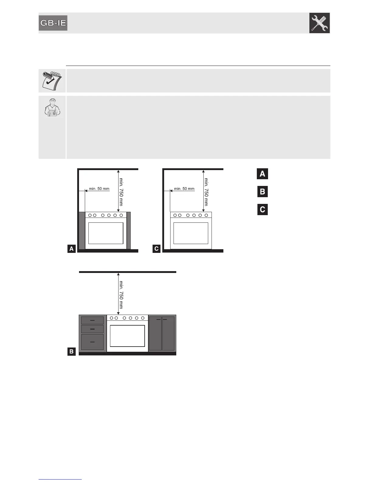 50 mm from the side of the appliance, as shown in figures A and C relative to the installation classes.