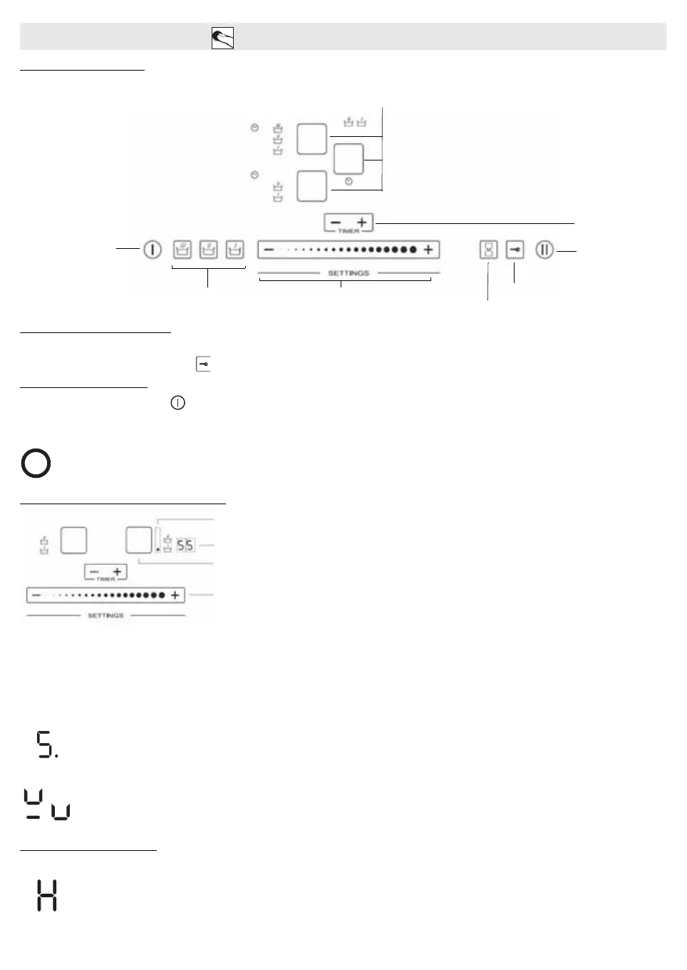“H” is the residual heat indicator. The hob is fitted with a residual heat indicator for each cooking zone; these indicators alert the user when cooking zones are