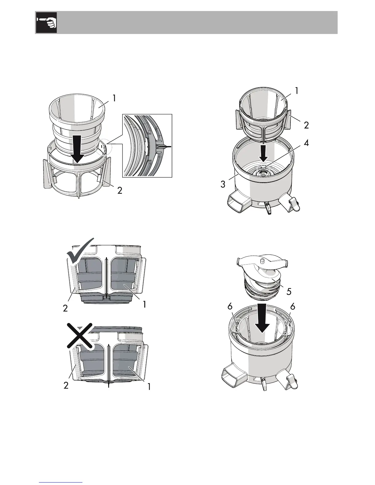 1. Insert the strainer (1) into the slots on the