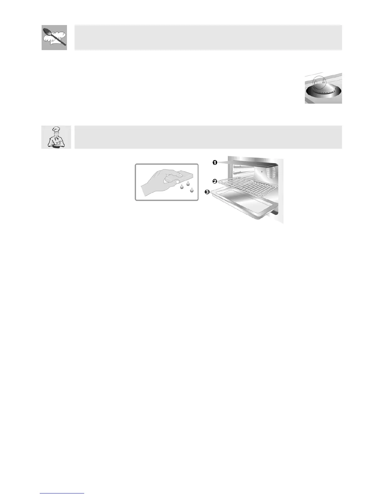 • Clean the oven shelves with hot water and non-abrasive detergents, rinse and dry.