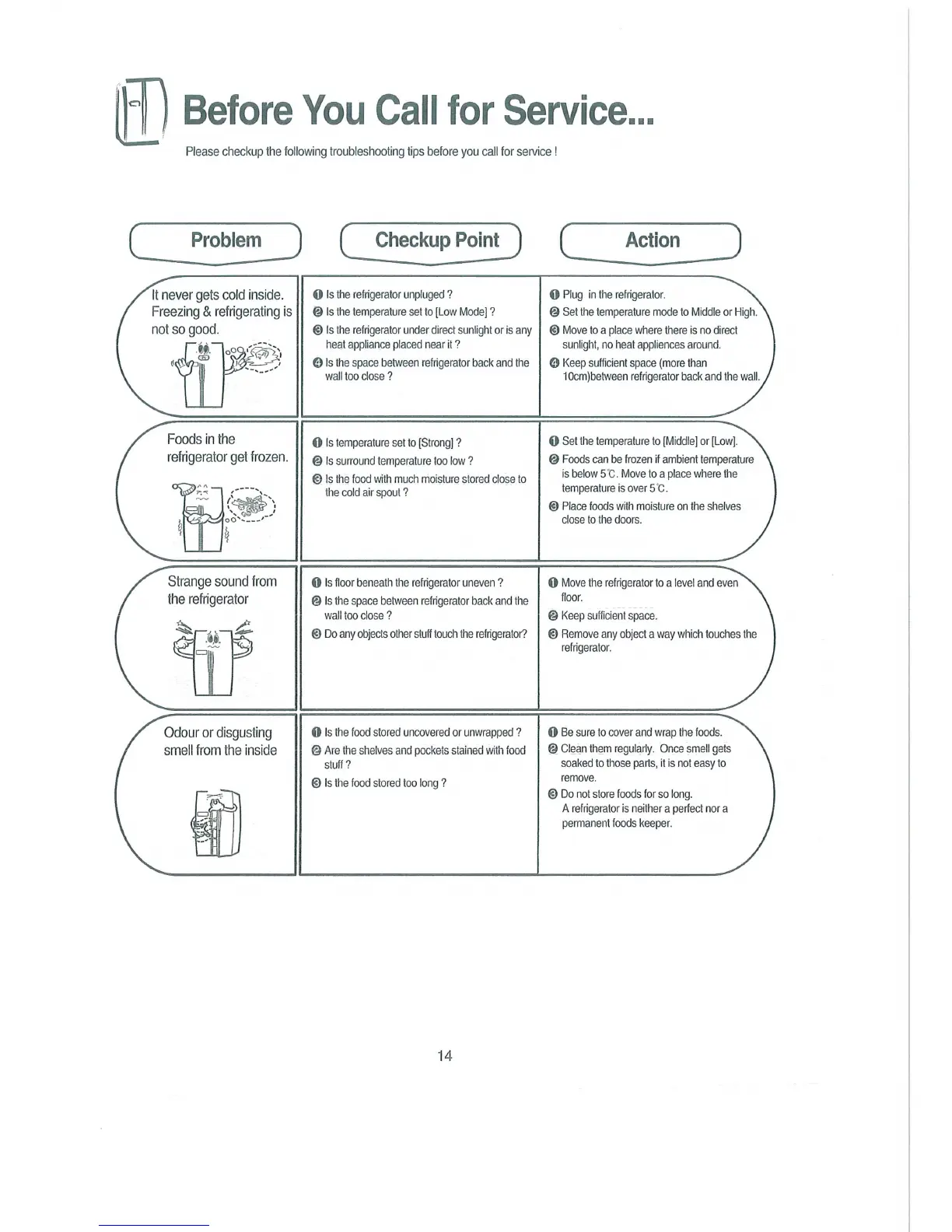 Smeg SR650XA - Before You Call for Service...; It never gets cold inside. Freezing & refrigerating is not so good.; Foods in the refrigerator get frozen.; Strange sound from the refrigerator