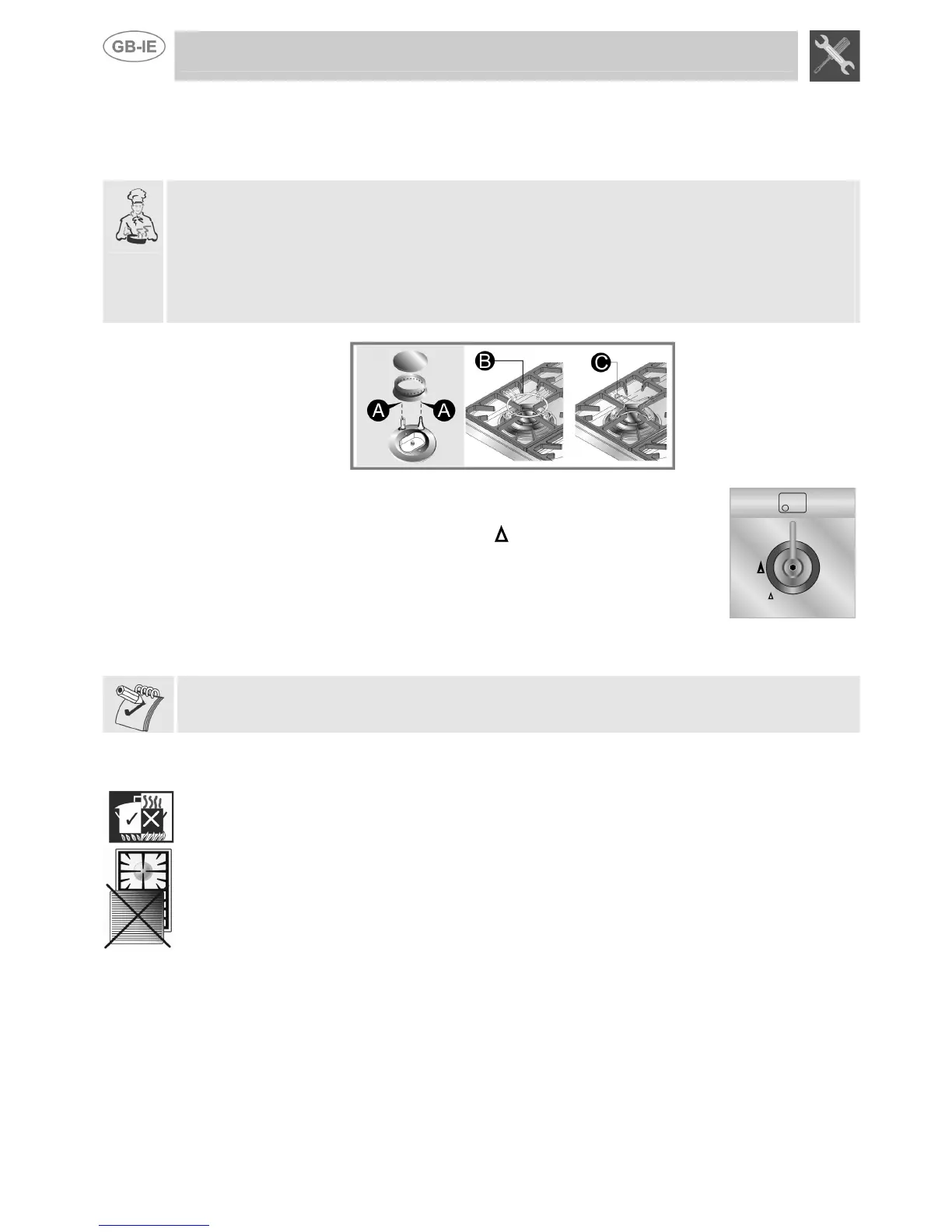 Before lighting the hob burners check that the flame caps are in the correct position and that