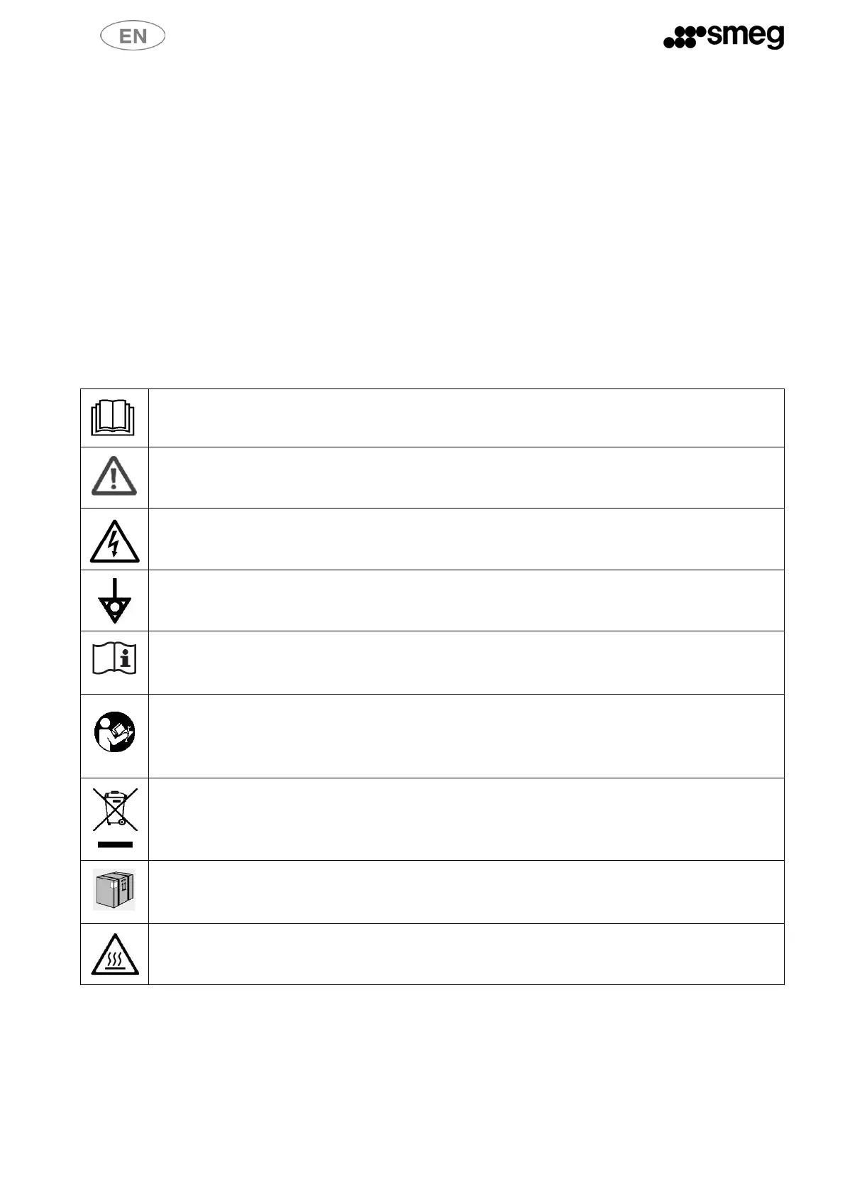 domestic waste collection service or your Smeg reseller. The appliance must be earthed in compliance with