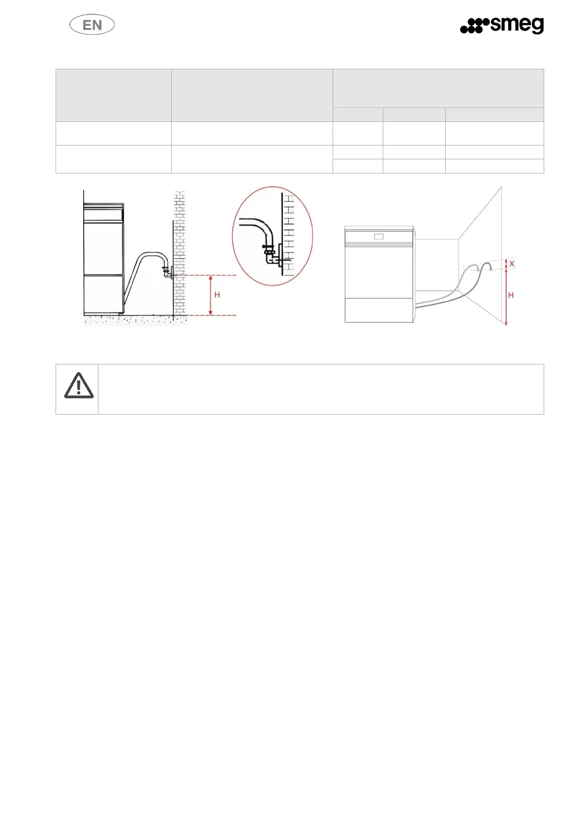 Fig. 6 – Drain connection. Drain connections – 65 cm < H < 80 cm. Dimension “X”: use only original drain hoses and the supplied tube bend guides. The