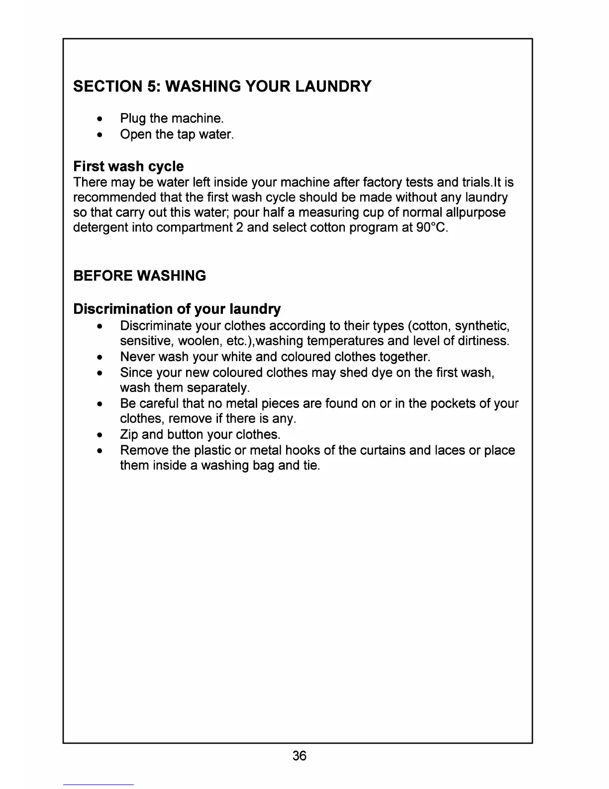 Smeg SWM60E - SECTION 5: WASHING YOUR LAUNDRY; Initial Wash Cycle and Laundry Sorting