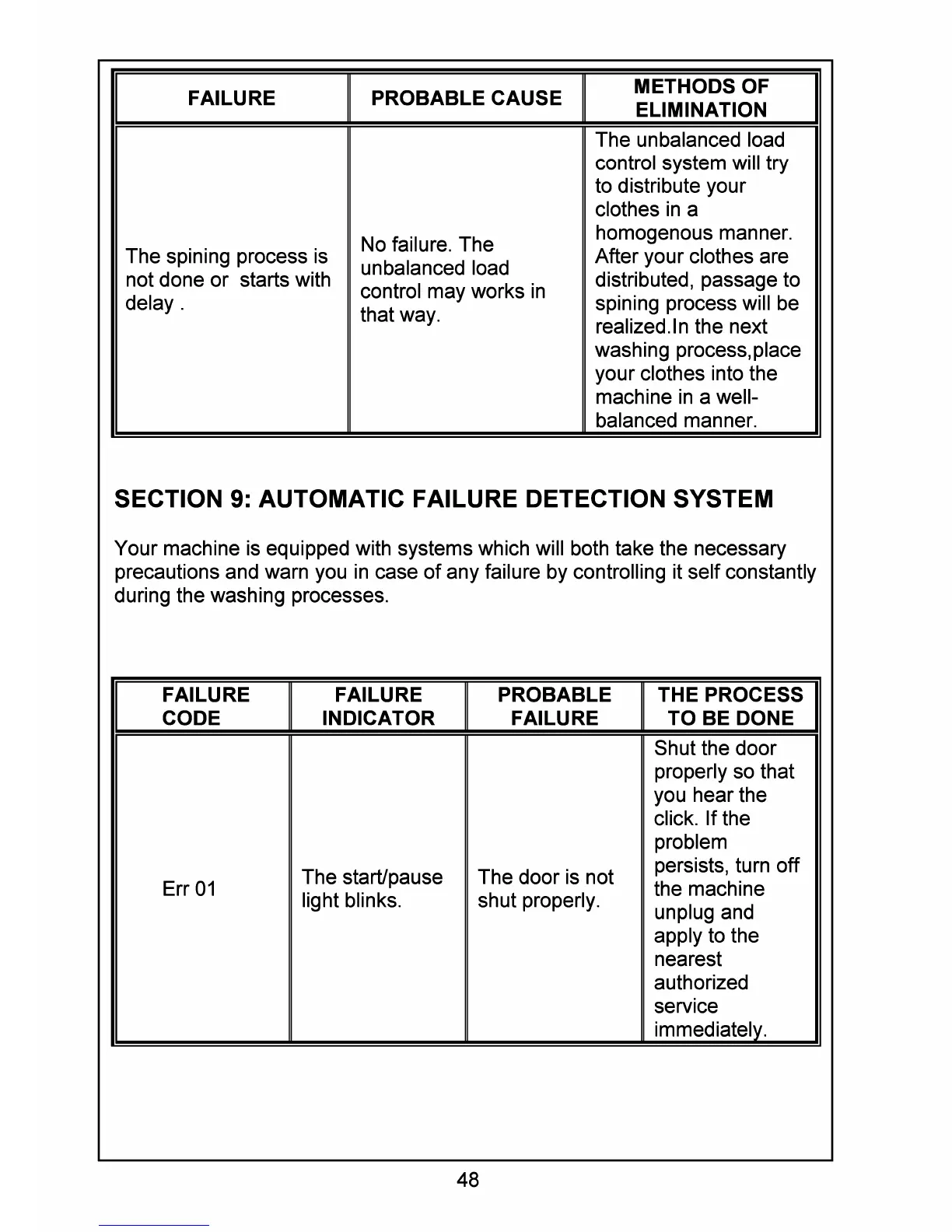 Smeg SWM60E - SECTION 9: AUTOMATIC FAILURE DETECTION SYSTEM; Error Codes and Indicators