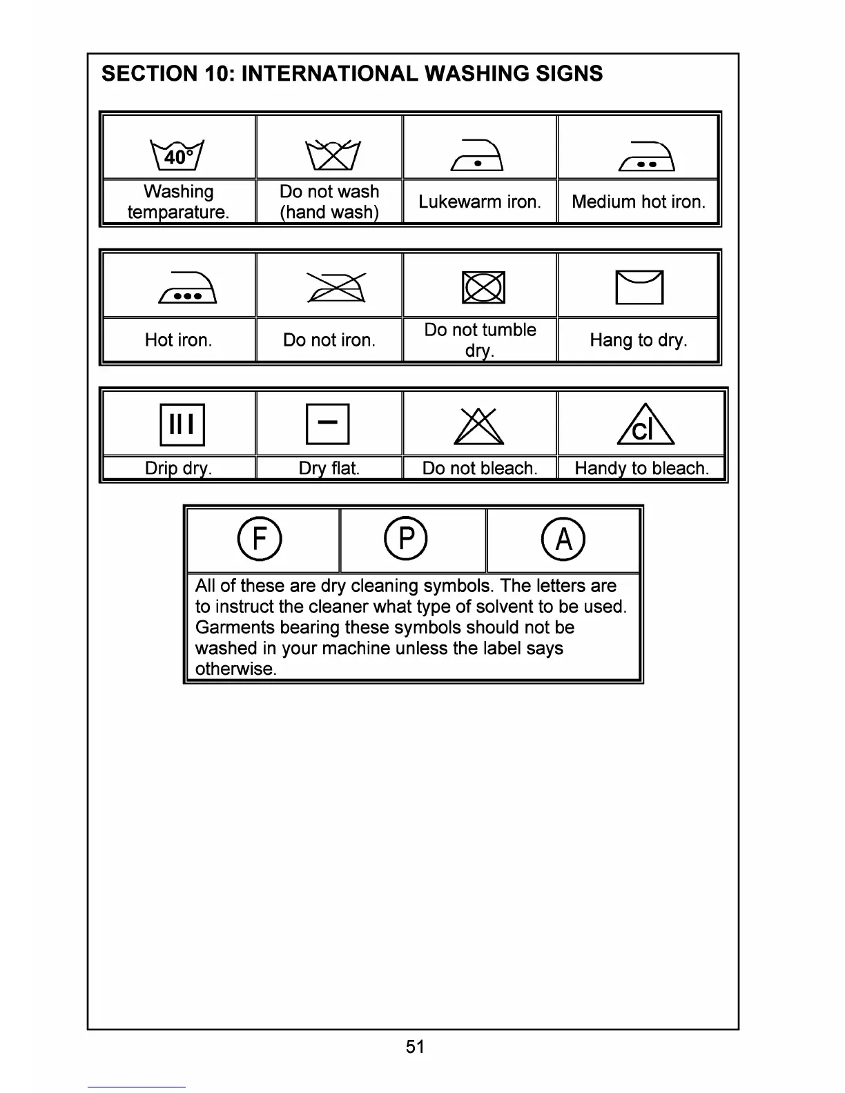 Smeg SWM60E - SECTION 10: INTERNATIONAL WASHING SIGNS; Washing and Drying Symbols