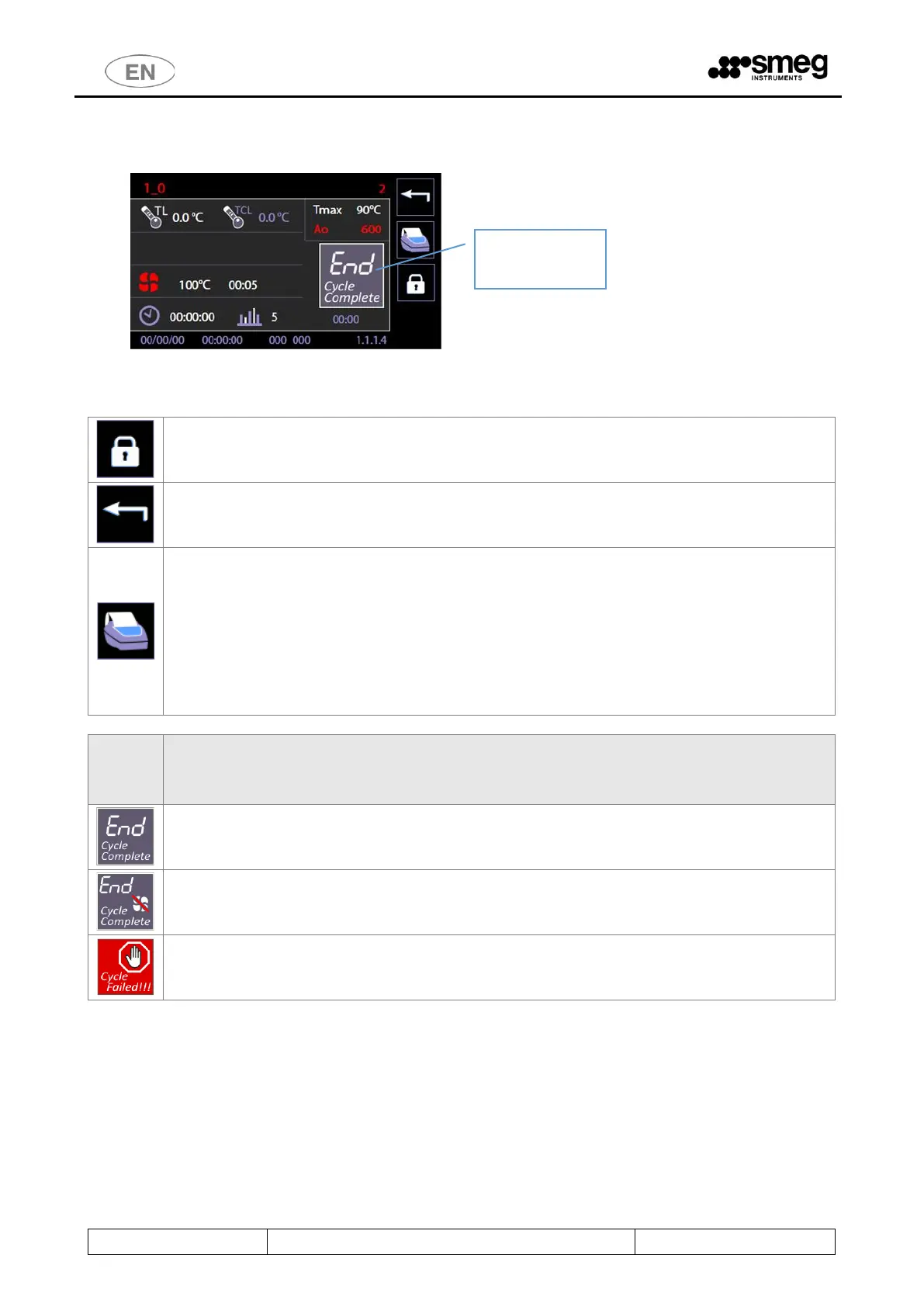At the end of the cycle, the screen displays an icon to indicate the status of the completed cycle (“END – Cycle complete”)