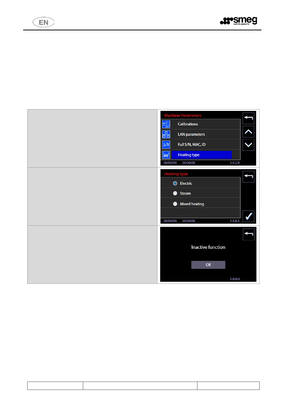 “Heating type”. If the optional Steam Heating system “STEAMFEED60” is installed, the superuser can