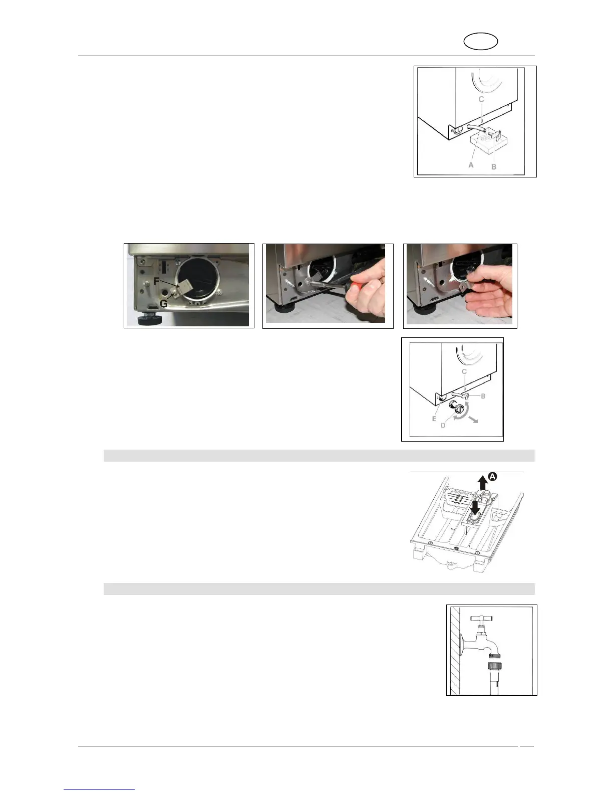 4. Unscrew the screw “G” with a screwdriver and remove the metal plate “F” which prevents the pump