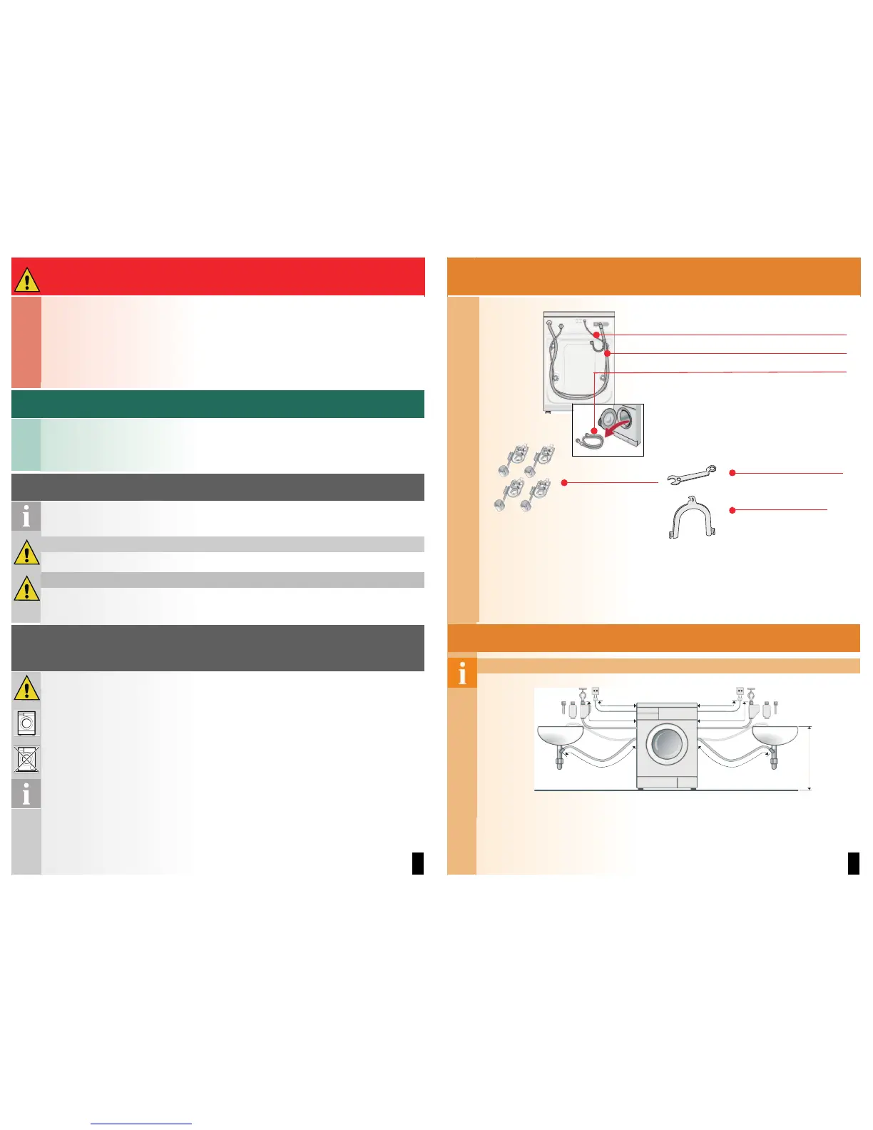 – Caution: frozen hoses can crack/burst. Do not install the washing machine outdoors or in