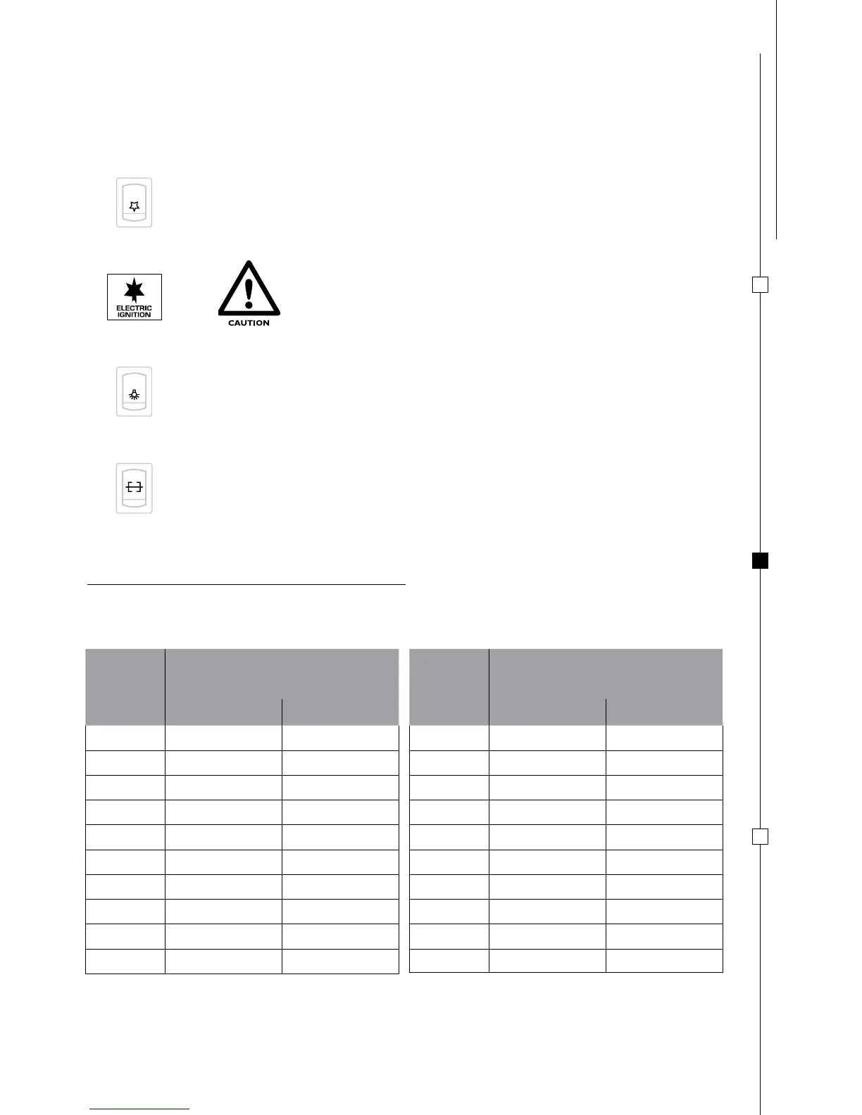 Technical specifications for burners referring to appliance model: