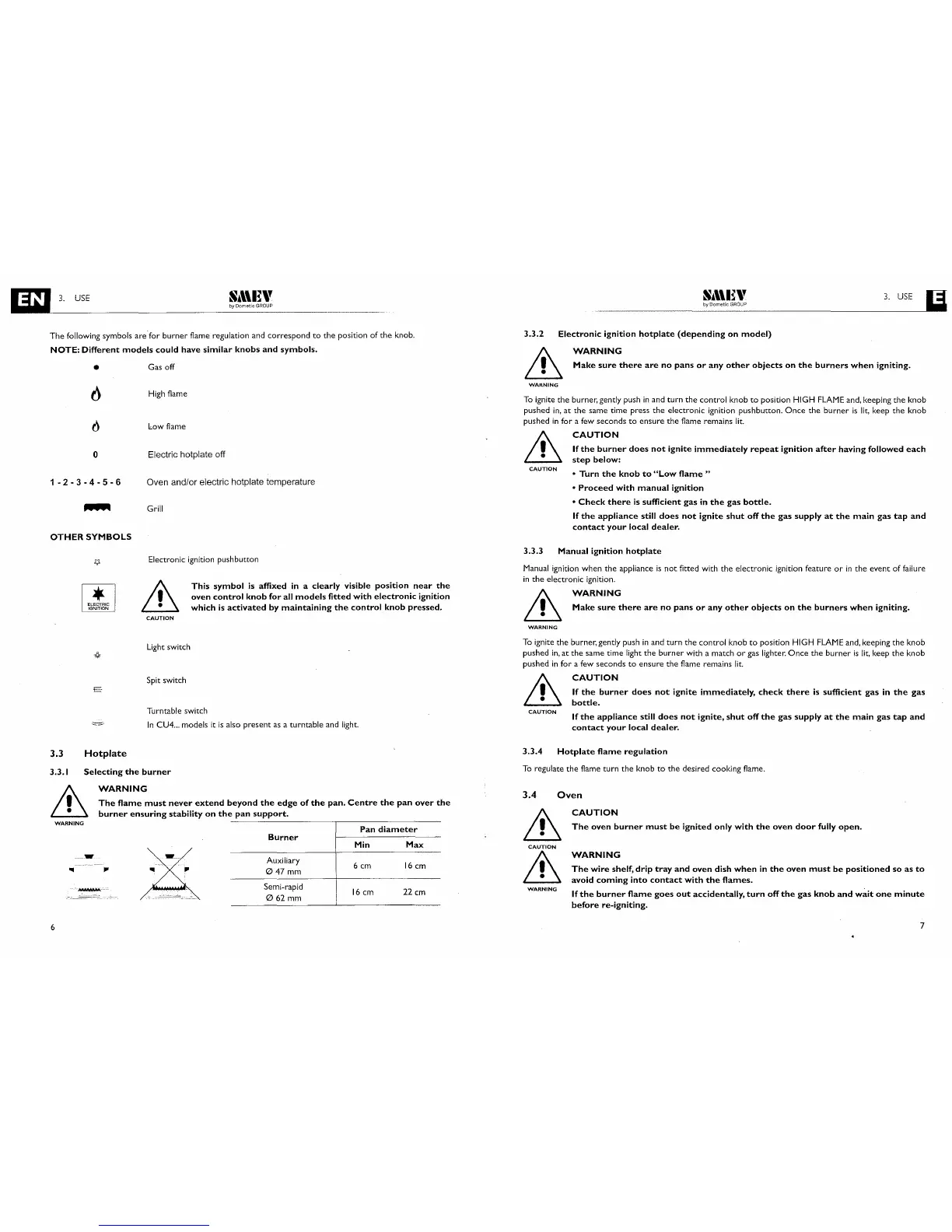 smev PI8023 - Appliance Usage: Hotplate; Burner Selection and Ignition; Hotplate Flame Adjustment; Appliance Usage: Oven