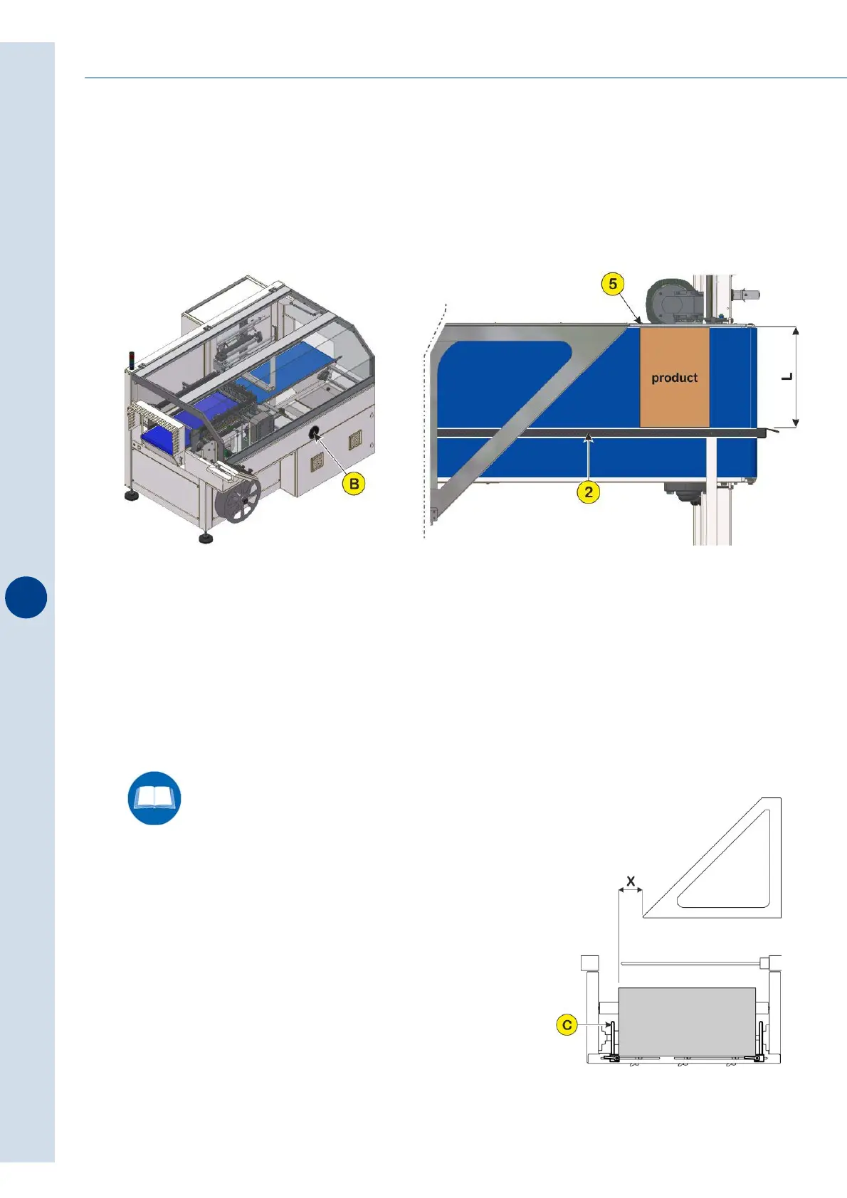 Act on the handwheel (B) to position the infeed belt depending on the width (L) of the product