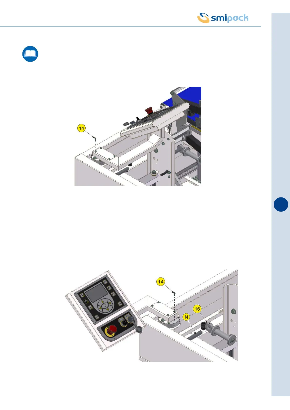 Loosen the screw (14) that secures the arm on which the operator panel is fitted.