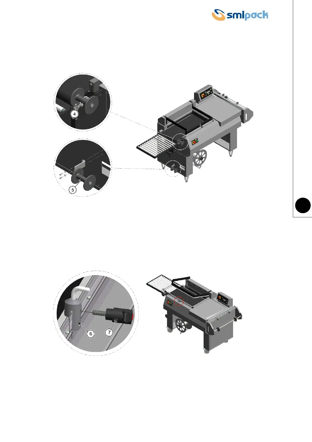 Mount the two film scrap tensioning rollers 4 and 5 in the relevant pre-drilled holes on the