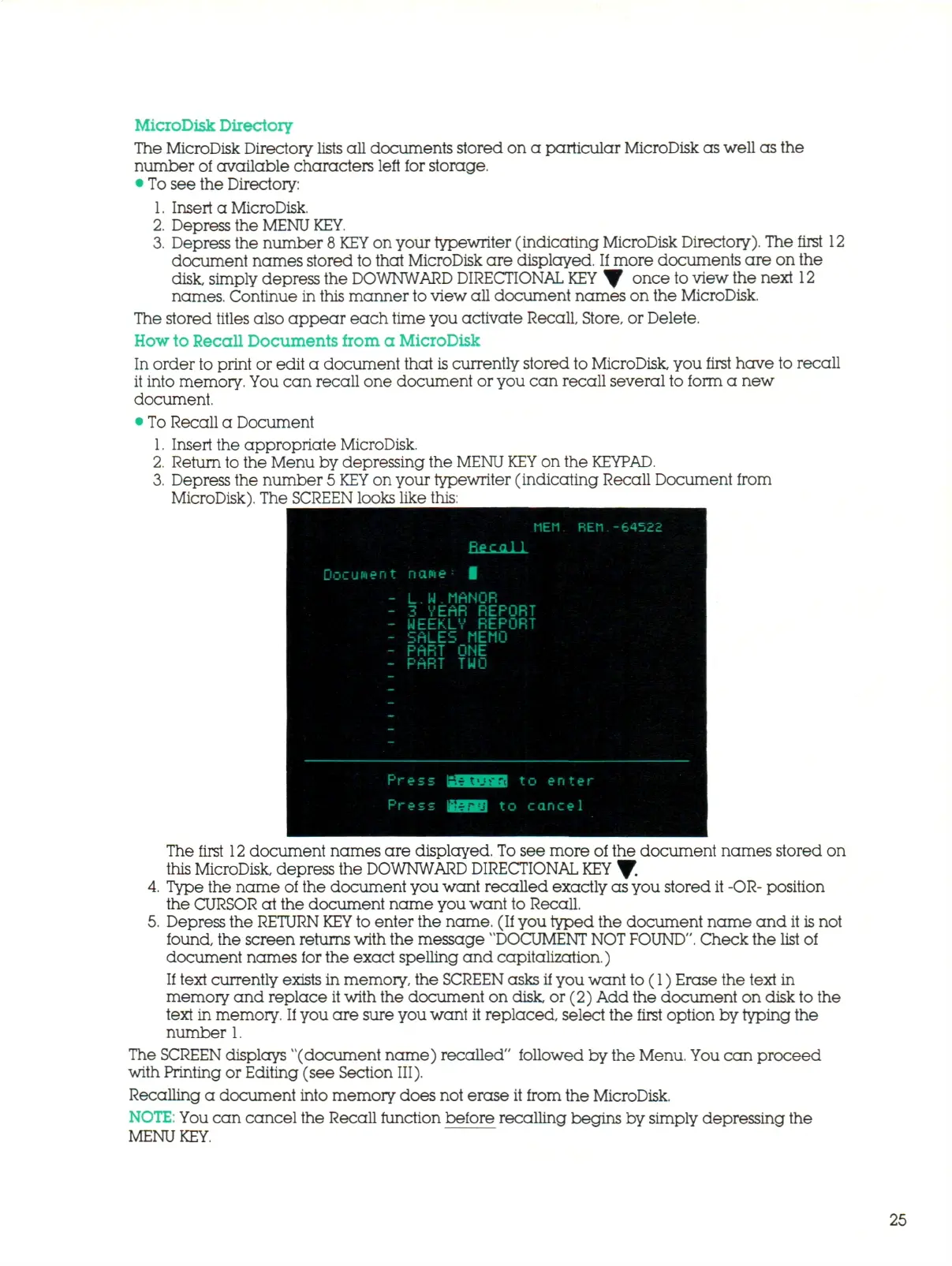 In order to print or edit a document that is currently stored to MicroDisk, you first have to recall